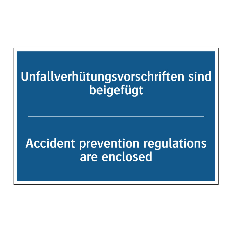 Zweisprachiges Verbotsschild mit deutschem Text Unfallverhütungsvorschriften sind beigefügt und englischem Text Accident prevention regulations are enclosed