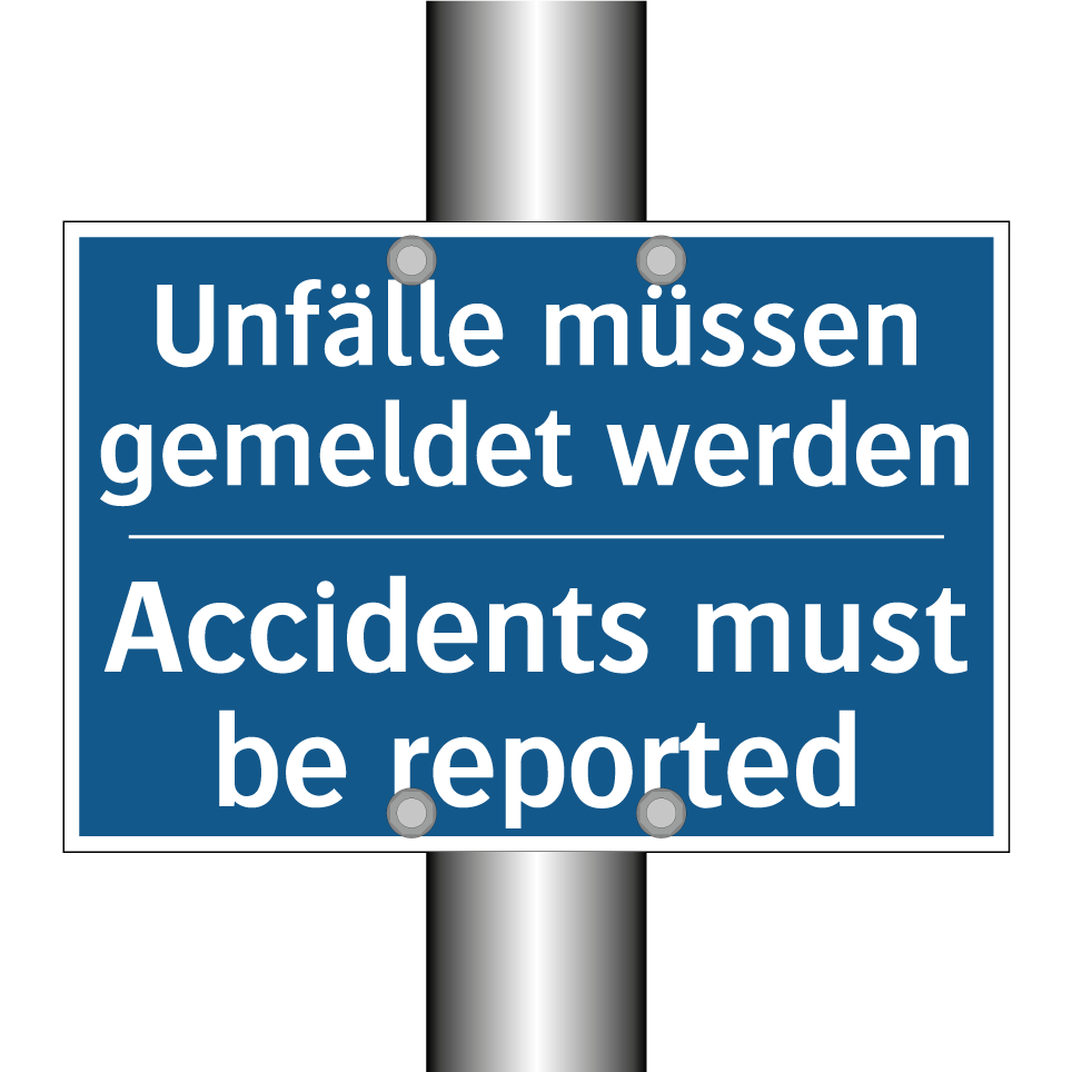Zweisprachiges Verbotsschild mit deutschem Text Unfälle müssen gemeldet werden und englischem Text Accidents must be reported