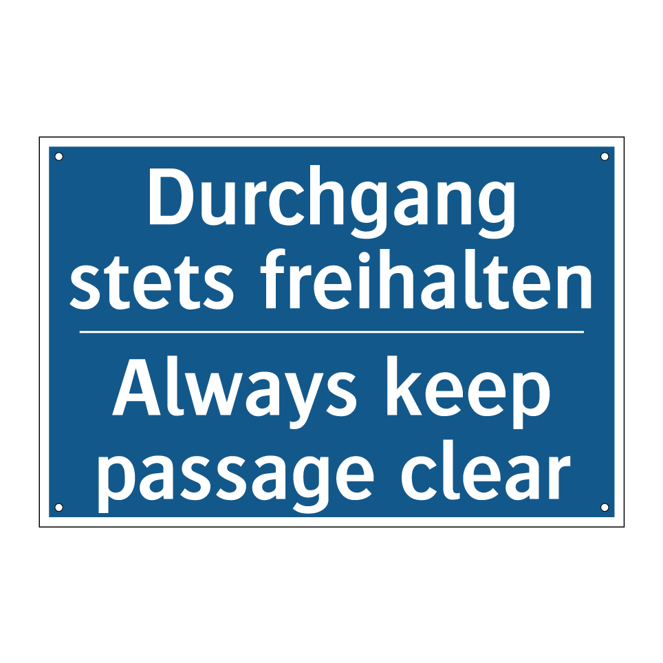 Zweisprachiges Verbotsschild mit deutschem Text Durchgang stets freihalten und englischem Text Always keep passage clear