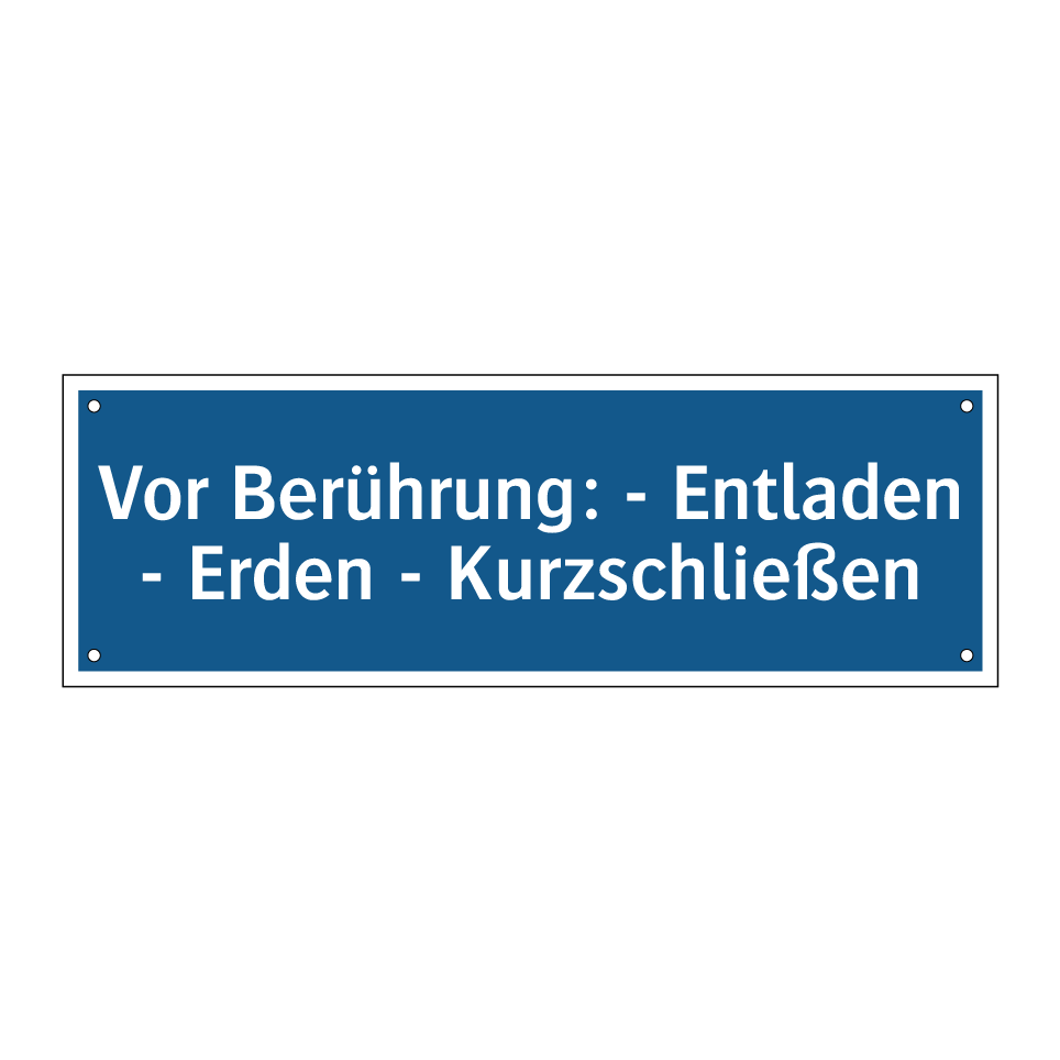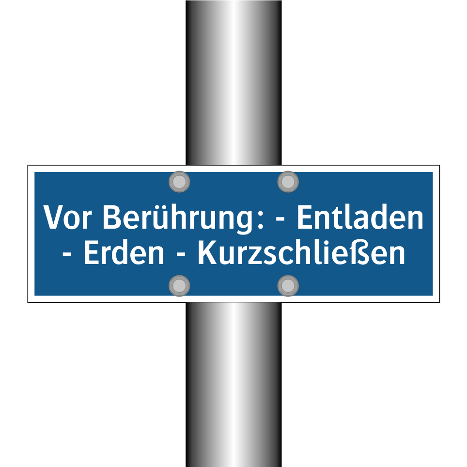 Gebotsschild mit dem Text Vor Berührung: - Entladen - Erden - Kurzschließen