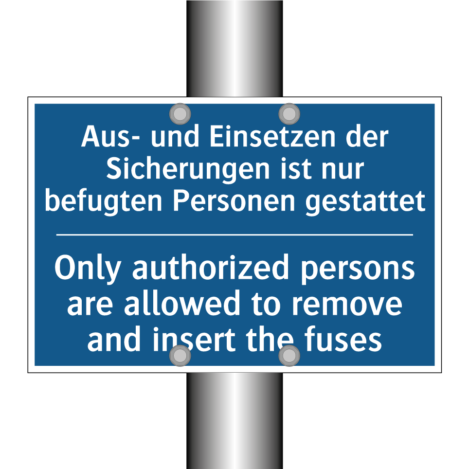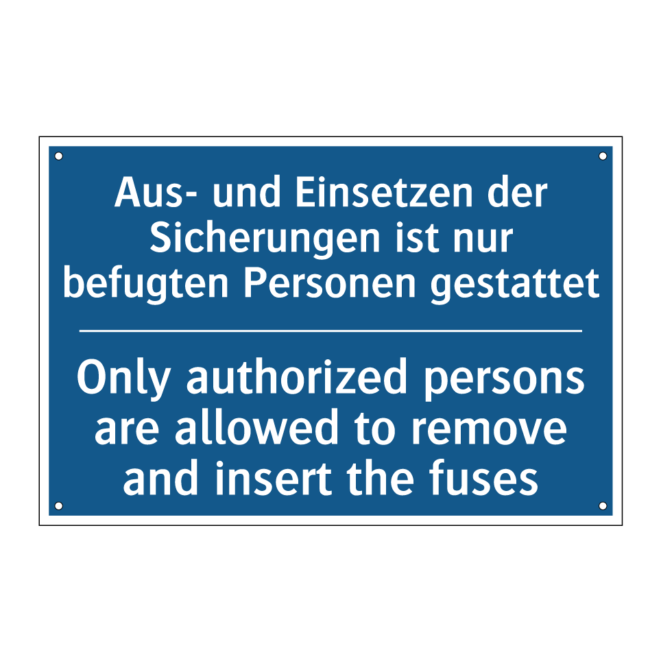 Zweisprachiges Verbotsschild mit deutschem Text Aus- und Einsetzen der Sicherungen ist nur befugten Personen gestattet und englischem Text Only authorized persons are allowed to remove and insert the fuses