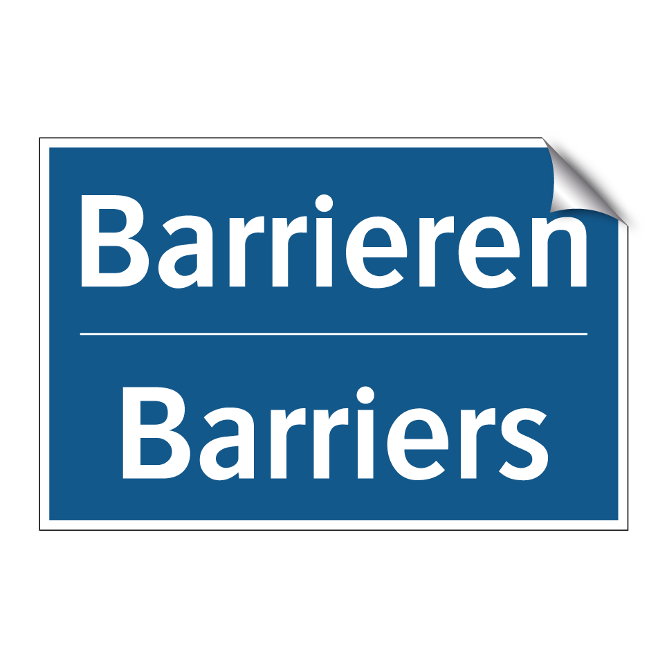 Zweisprachiges Verbotsschild mit deutschem Text Barrieren und englischem Text Barriers