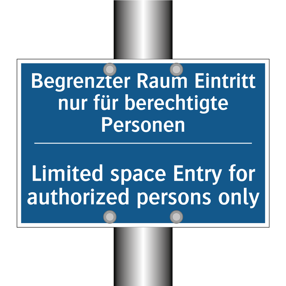 Zweisprachiges Verbotsschild mit deutschem Text Begrenzter Raum Eintritt nur für berechtigte Personen und englischem Text Limited space Entry for authorized persons only