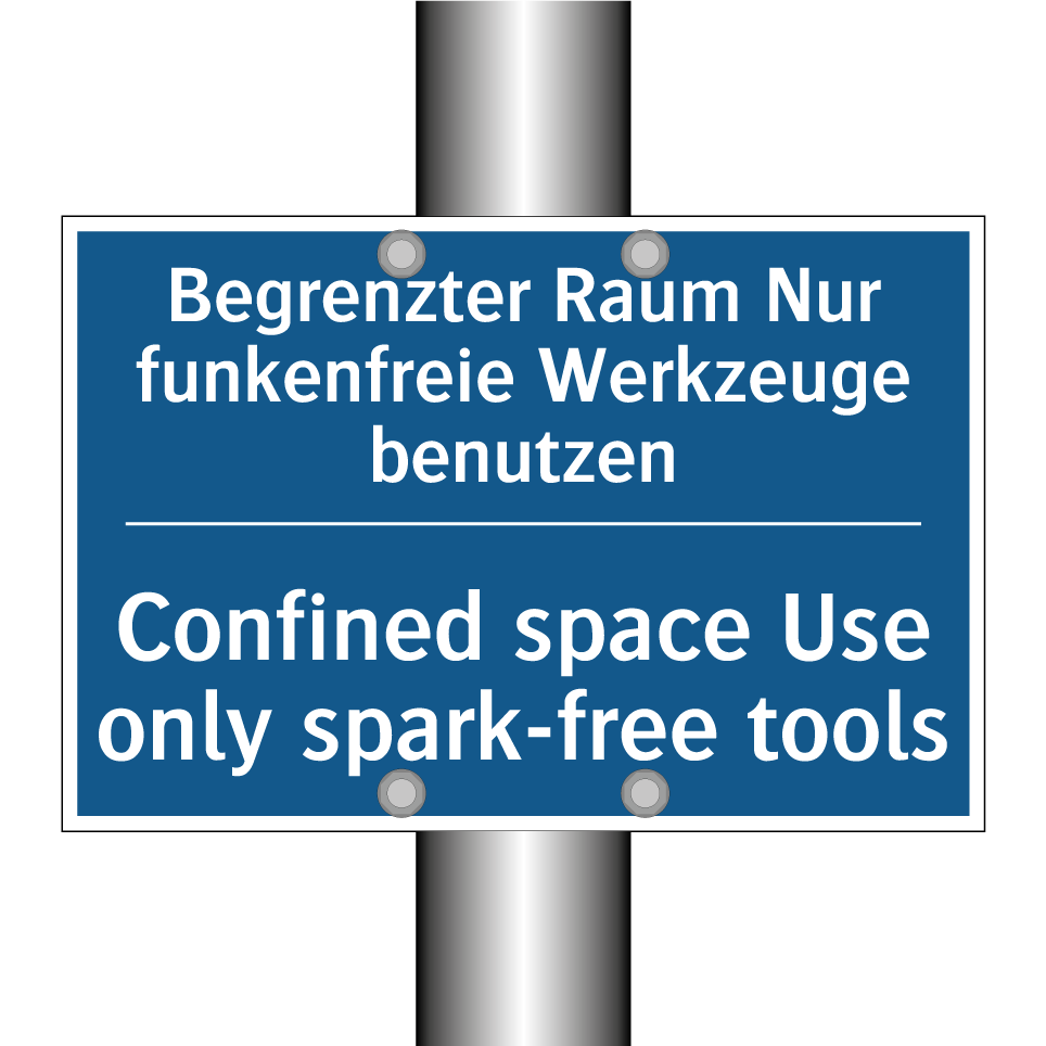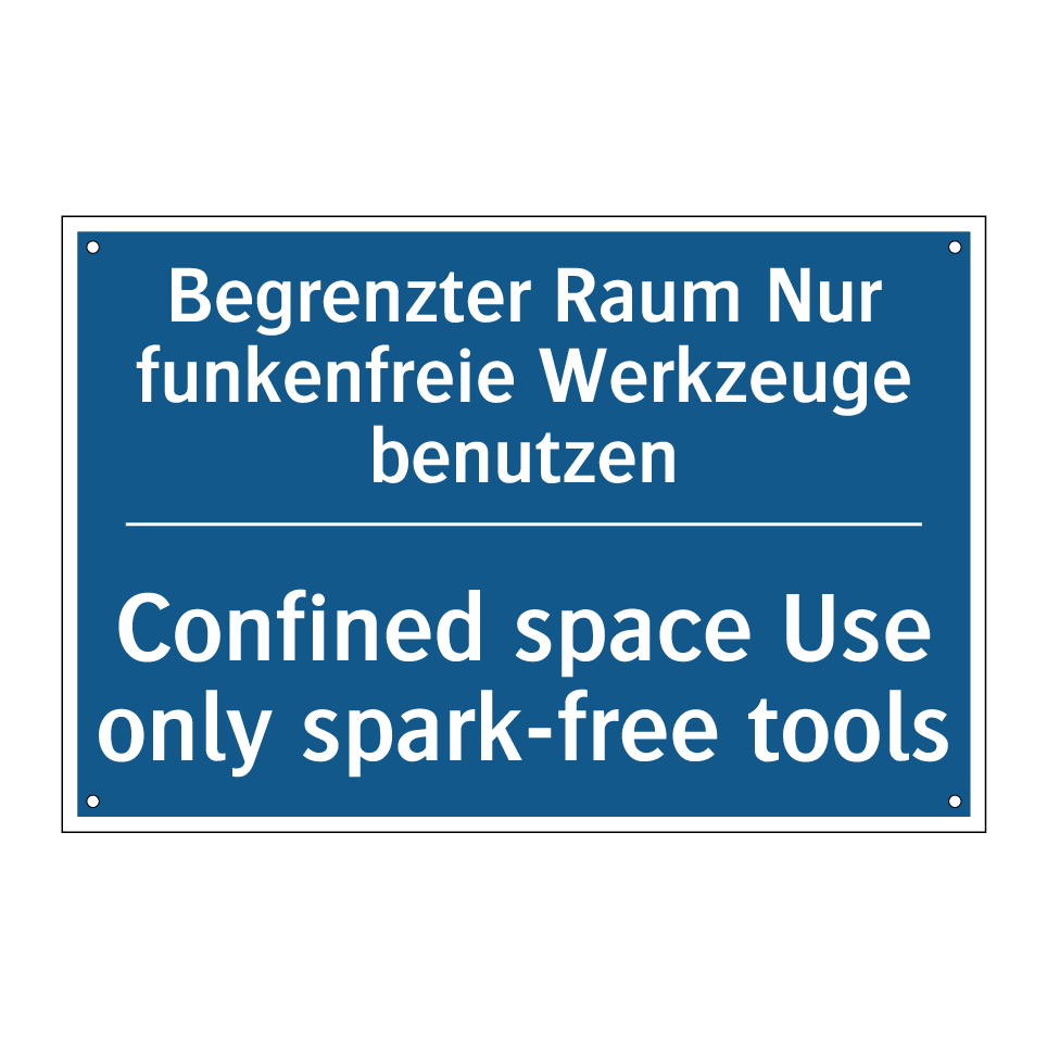 Zweisprachiges Verbotsschild mit deutschem Text Begrenzter Raum Nur funkenfreie Werkzeuge benutzen und englischem Text Confined space Use only spark-free tools