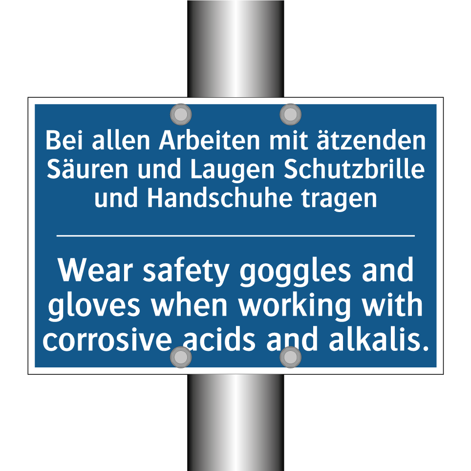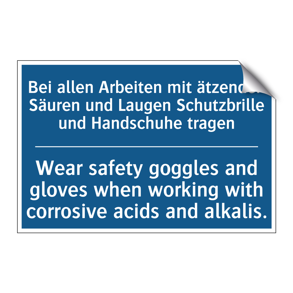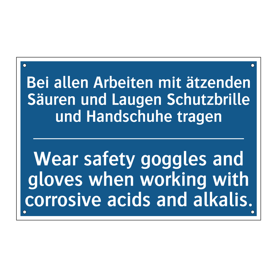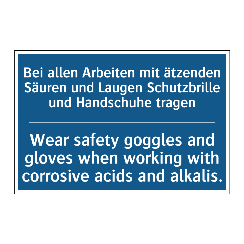 Zweisprachiges Verbotsschild mit deutschem Text Bei allen Arbeiten mit ätzenden Säuren und Laugen Schutzbrille und Handschuhe tragen und englischem Text Wear safety goggles and gloves when working with corrosive acids and alkalis.