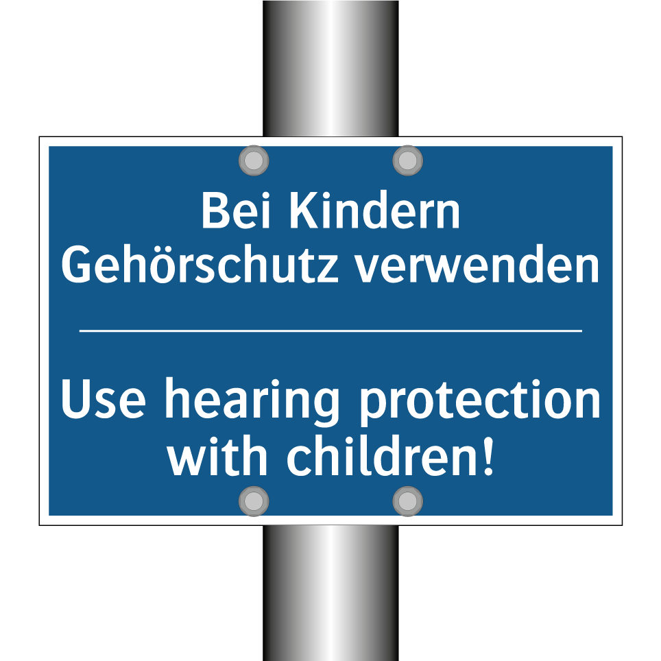 Zweisprachiges Verbotsschild mit deutschem Text Bei Kindern Gehörschutz verwenden und englischem Text Use hearing protection with children!