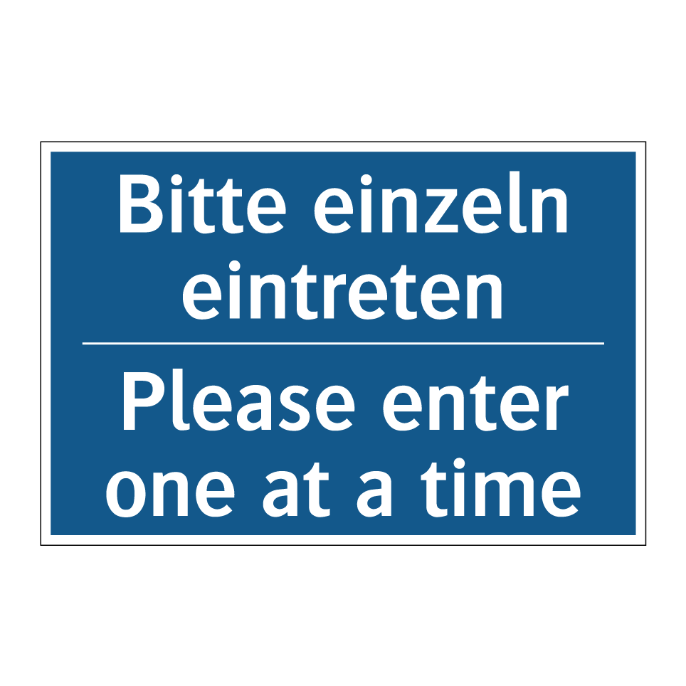 Zweisprachiges Verbotsschild mit deutschem Text Bitte einzeln eintreten und englischem Text Please enter one at a time