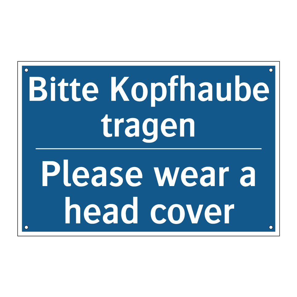 Zweisprachiges Verbotsschild mit deutschem Text Bitte Kopfhaube tragen und englischem Text Please wear a head cover