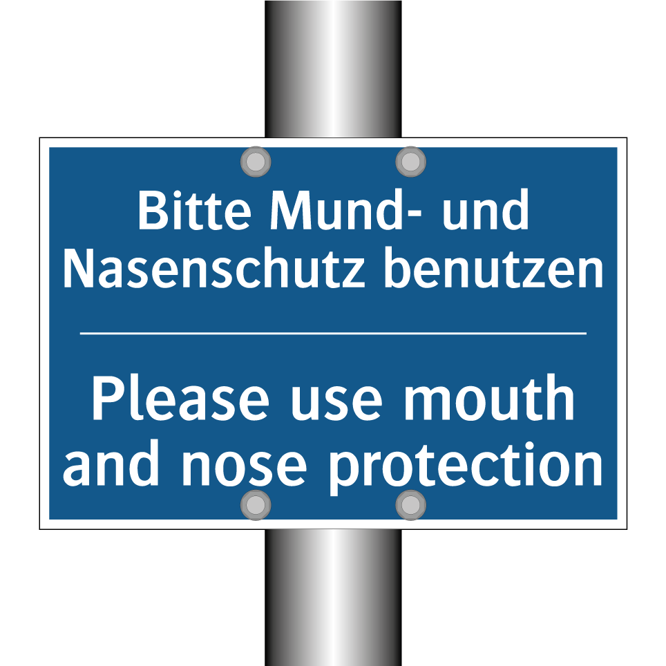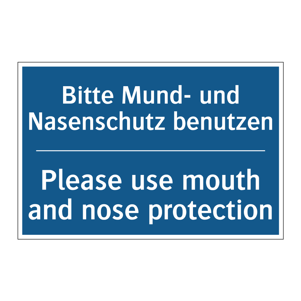 Zweisprachiges Verbotsschild mit deutschem Text Bitte Mund- und Nasenschutz benutzen und englischem Text Please use mouth and nose protection