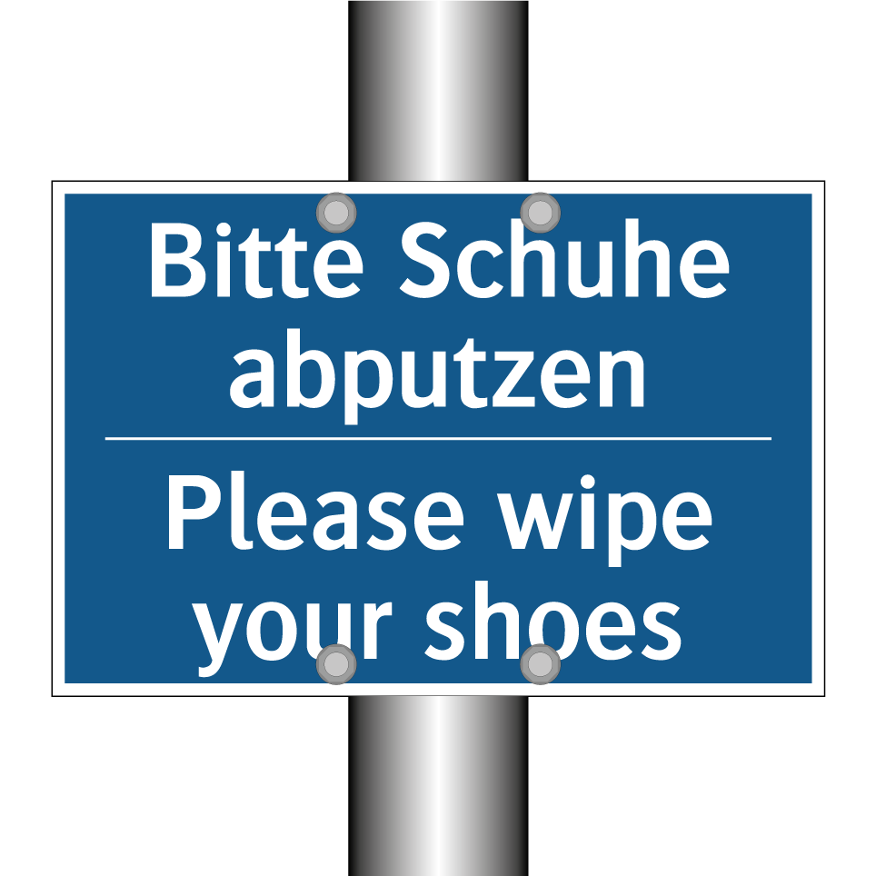 Zweisprachiges Verbotsschild mit deutschem Text Bitte Schuhe abputzen und englischem Text Please wipe your shoes