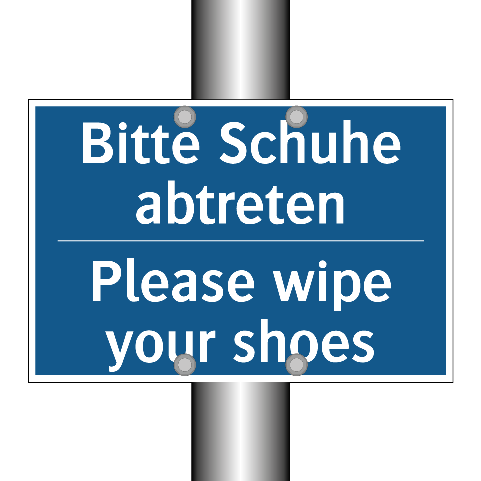 Diese Gebotsschild mit blauem Hintergrund und weißer Schrift ist ideal für den Einsatz in Bereichen, in denen Sauberkeit und Ordnung wichtig sind. Die zweisprachige Beschriftung auf Deutsch und Englisch macht sie besonders nützlich in internationalen Umgebungen, wie Flughäfen, Hotels oder Bürogebäuden, wo Besucher aus verschiedenen Ländern erwartet werden. Die klare Anweisung, die Schuhe abzutreten, hilft dabei, Schmutz und Feuchtigkeit draußen zu halten und die Innenräume sauber zu halten. Diese Gebotsschild kann strategisch an Eingängen, in Foyers oder in Empfangsbereichen platziert werden, um sicherzustellen, dass alle Besucher die Anweisung leicht erkennen und befolgen können.