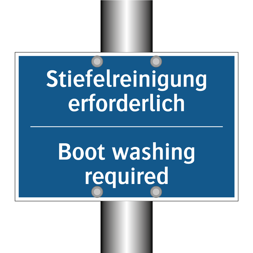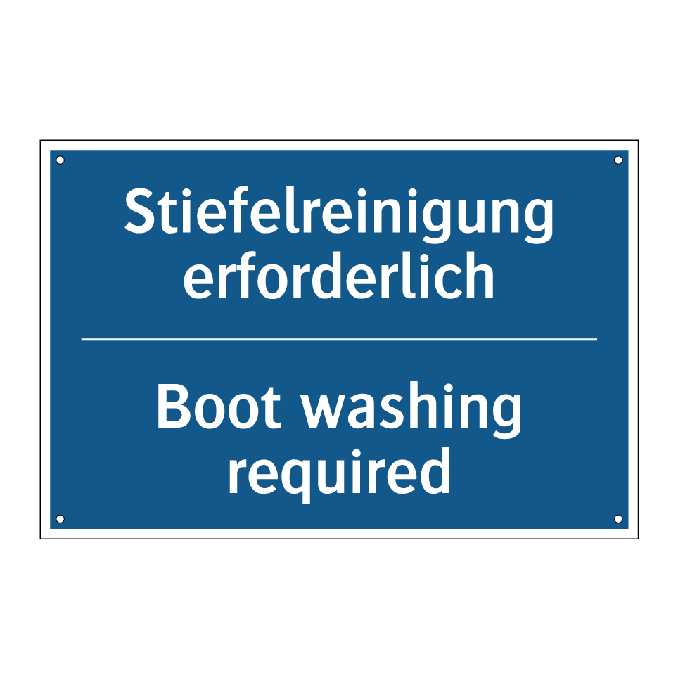 Zweisprachiges Verbotsschild mit deutschem Text Stiefelreinigung erforderlich und englischem Text Boot washing required