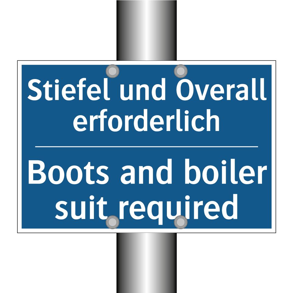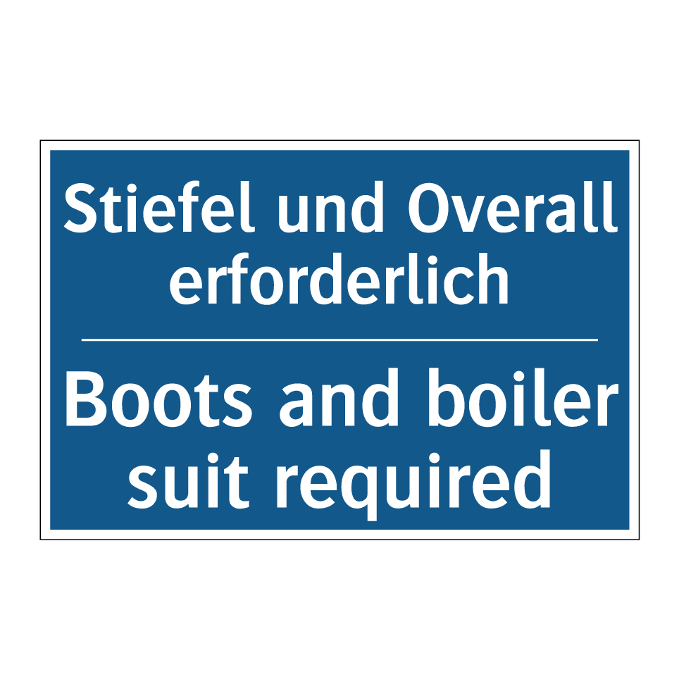 Zweisprachiges Verbotsschild mit deutschem Text Stiefel und Overall erforderlich und englischem Text Boots and boiler suit required