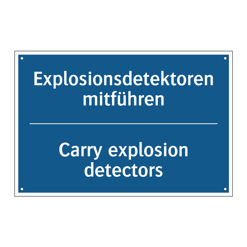 Zweisprachiges Verbotsschild mit deutschem Text Explosionsdetektoren mitführen und englischem Text Carry explosion detectors