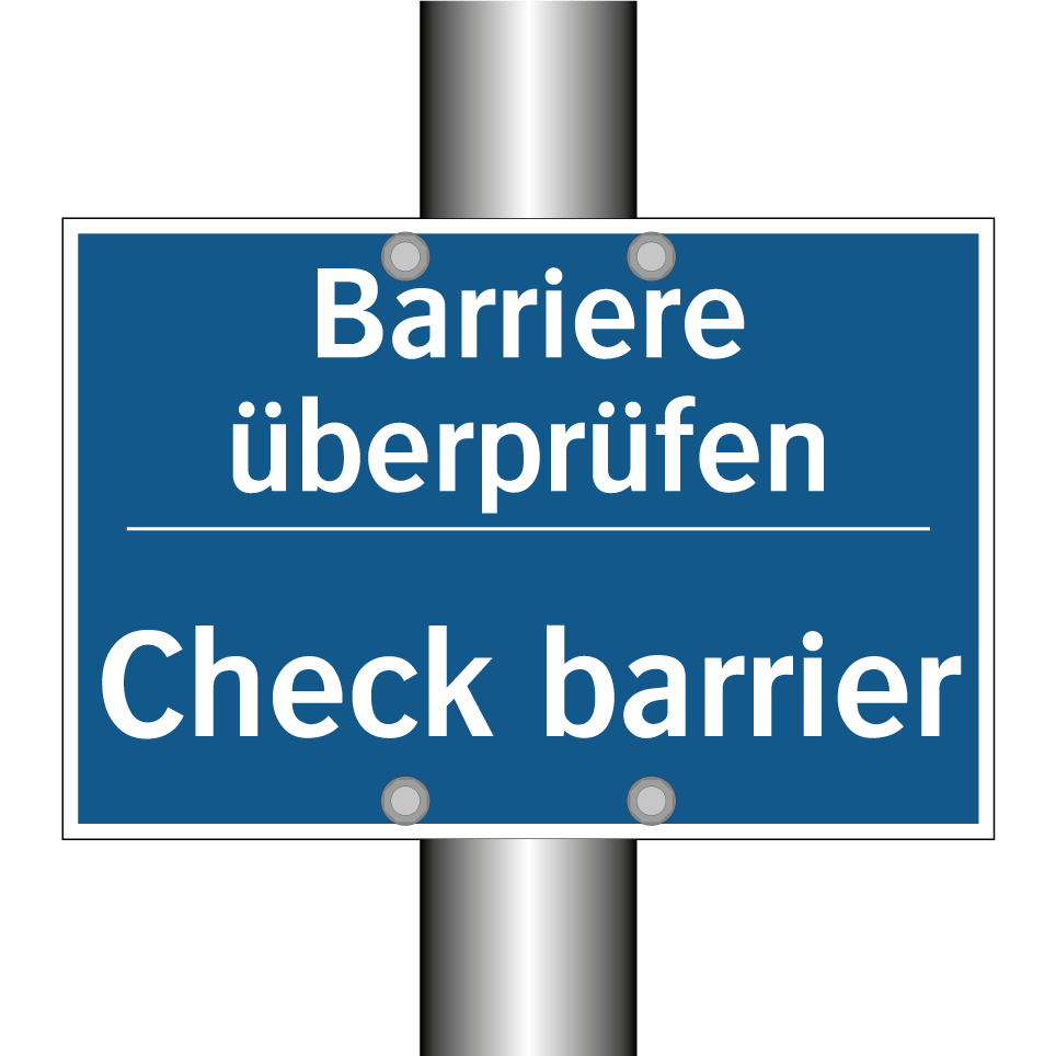 Zweisprachiges Verbotsschild mit deutschem Text Barriere überprüfen und englischem Text Check barrier