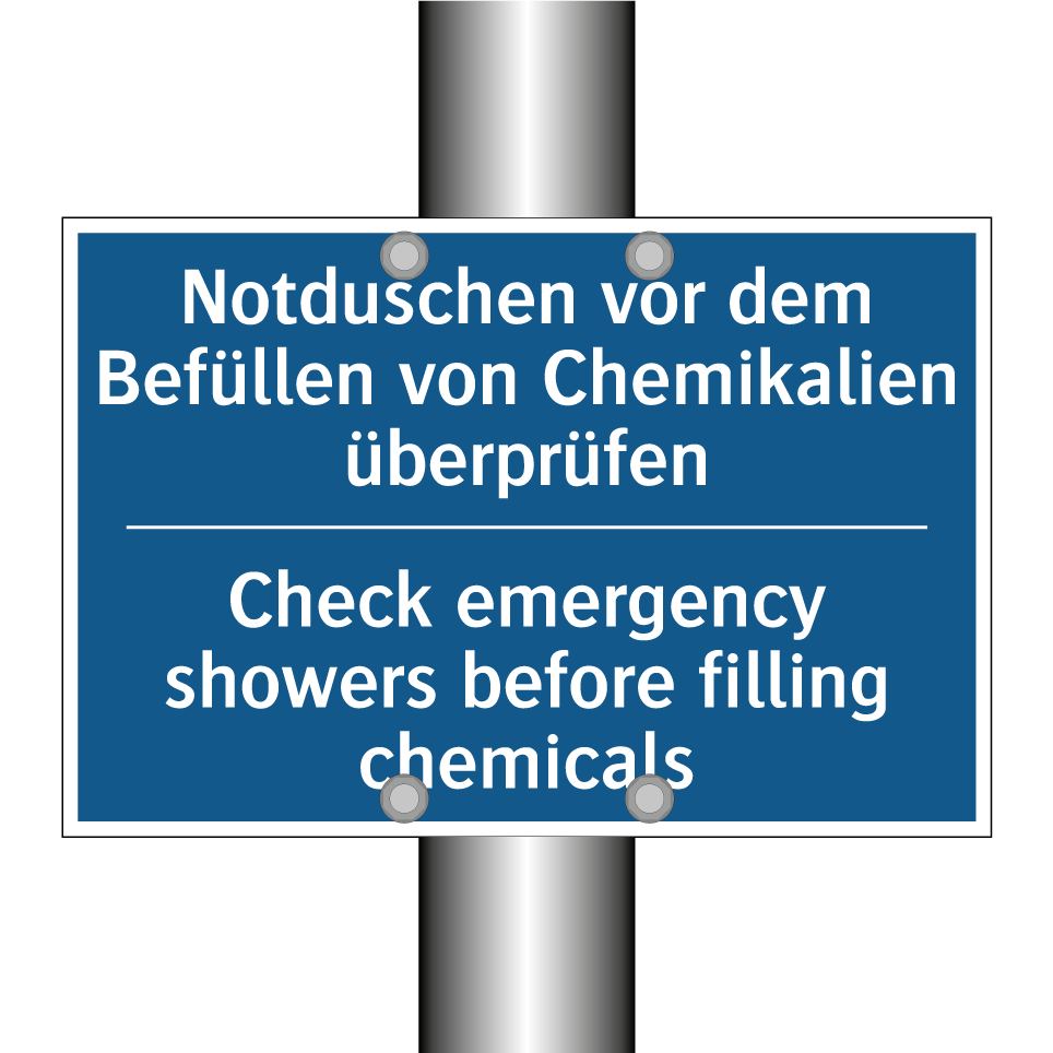 Zweisprachiges Verbotsschild mit deutschem Text Notduschen vor dem Befüllen von Chemikalien überprüfen und englischem Text Check emergency showers before filling chemicals