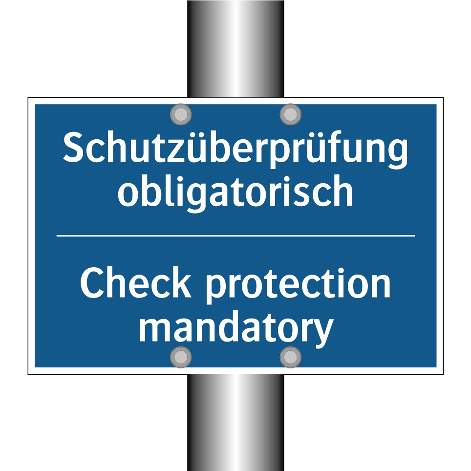 Zweisprachiges Verbotsschild mit deutschem Text Schutzüberprüfung obligatorisch und englischem Text Check protection mandatory