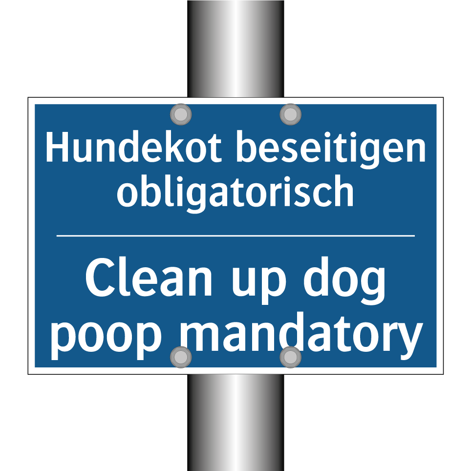 Zweisprachiges Verbotsschild mit deutschem Text Hundekot beseitigen obligatorisch und englischem Text Clean up dog poop mandatory