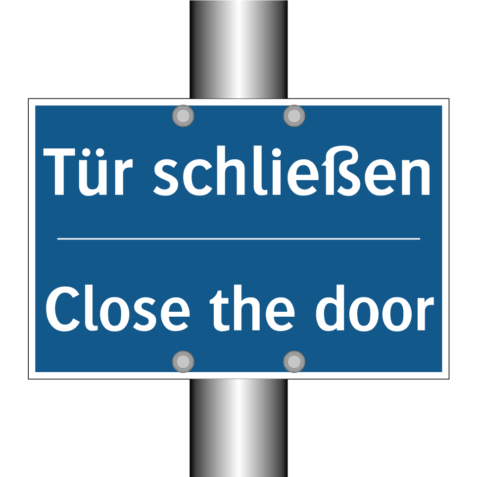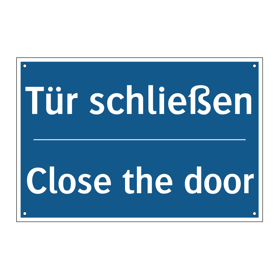 Zweisprachiges Verbotsschild mit deutschem Text Tür schließen und englischem Text Close the door