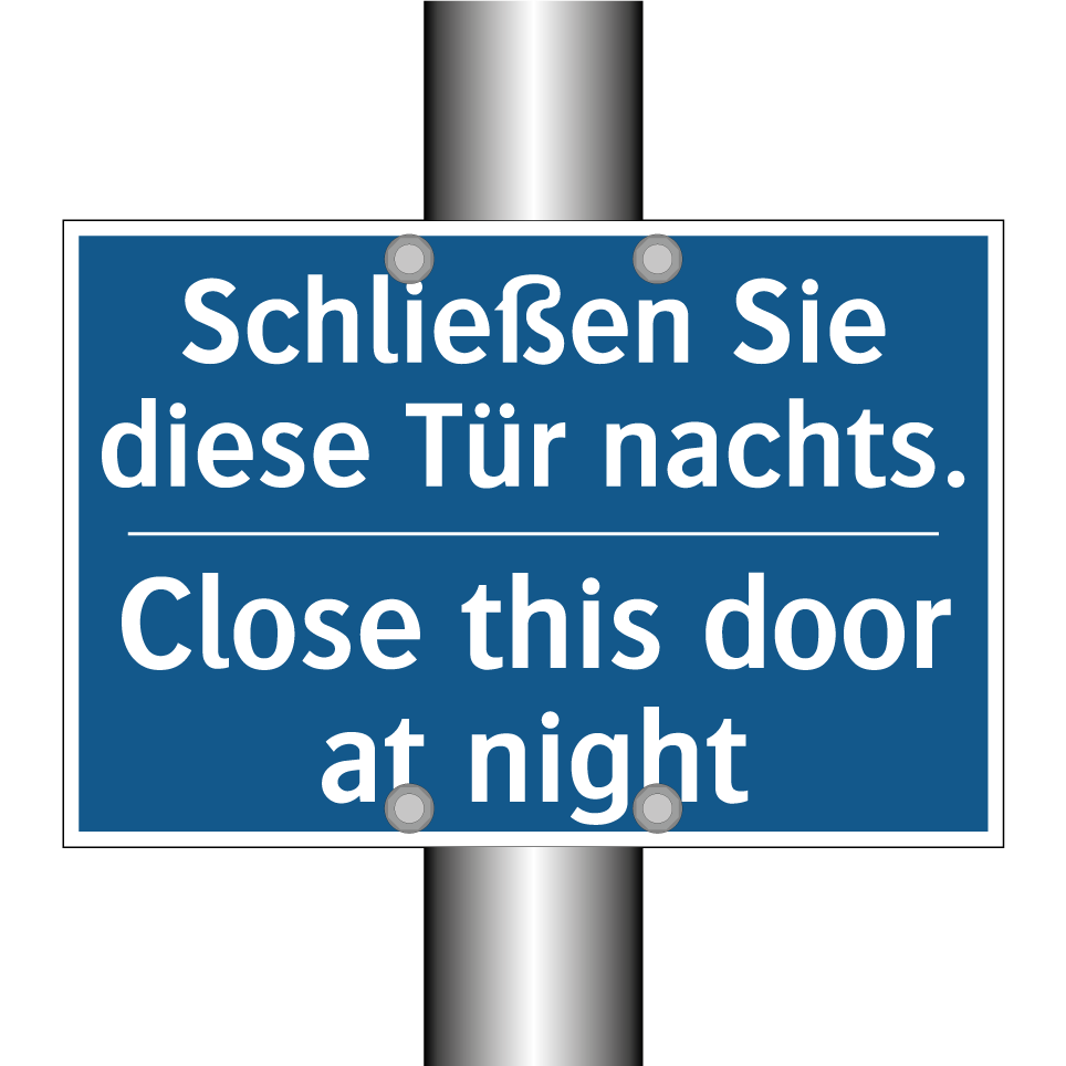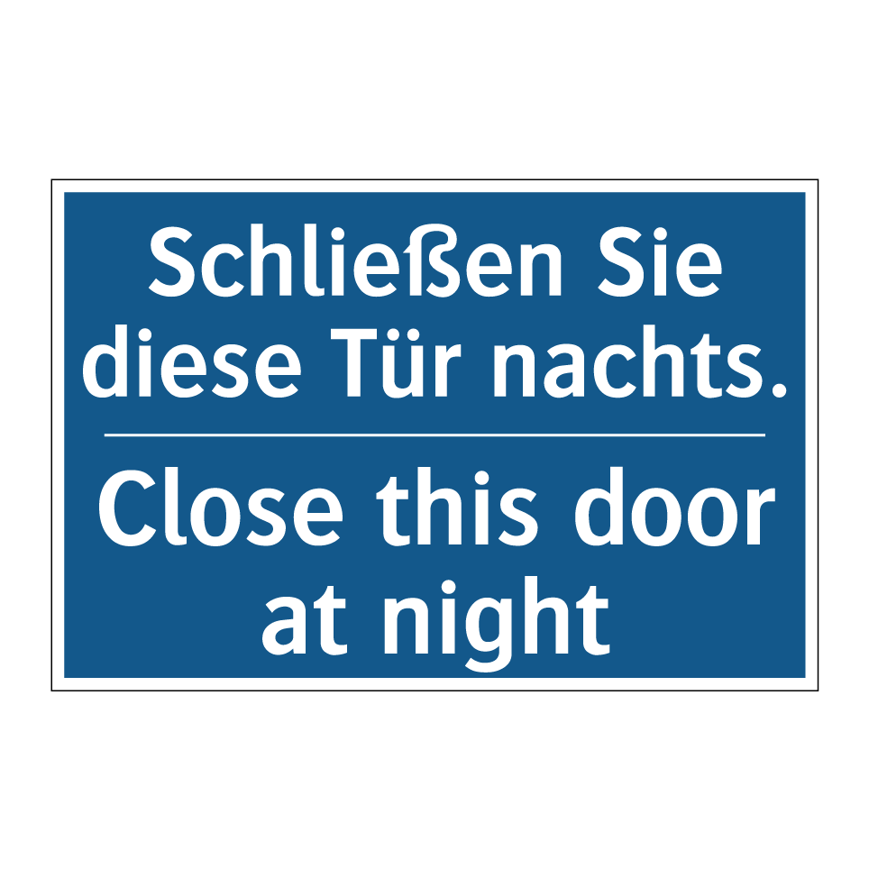 Entdecken Sie die Vielseitigkeit dieser Gebotsschild, die sowohl auf Deutsch als auch auf Englisch gestaltet ist. Diese zweisprachige Beschilderung ist ideal für Orte, an denen internationale Besucher erwartet werden, wie Hotels, Hostels oder internationale Büros. Die klare Anweisung, die Tür nachts zu schließen, sorgt für zusätzliche Sicherheit und Schutz. Platzieren Sie diese Gebotsschild an Eingängen, Fluren oder anderen strategischen Punkten, um sicherzustellen, dass die Anweisung befolgt wird. Die blaue Hintergrundfarbe mit weißem Text sorgt für eine hohe Sichtbarkeit und zieht die Aufmerksamkeit auf sich, was die Einhaltung der Anweisung erleichtert. Nutzen Sie die Vorteile der zweisprachigen Kommunikation, um ein breiteres Publikum zu erreichen und Missverständnisse zu vermeiden.