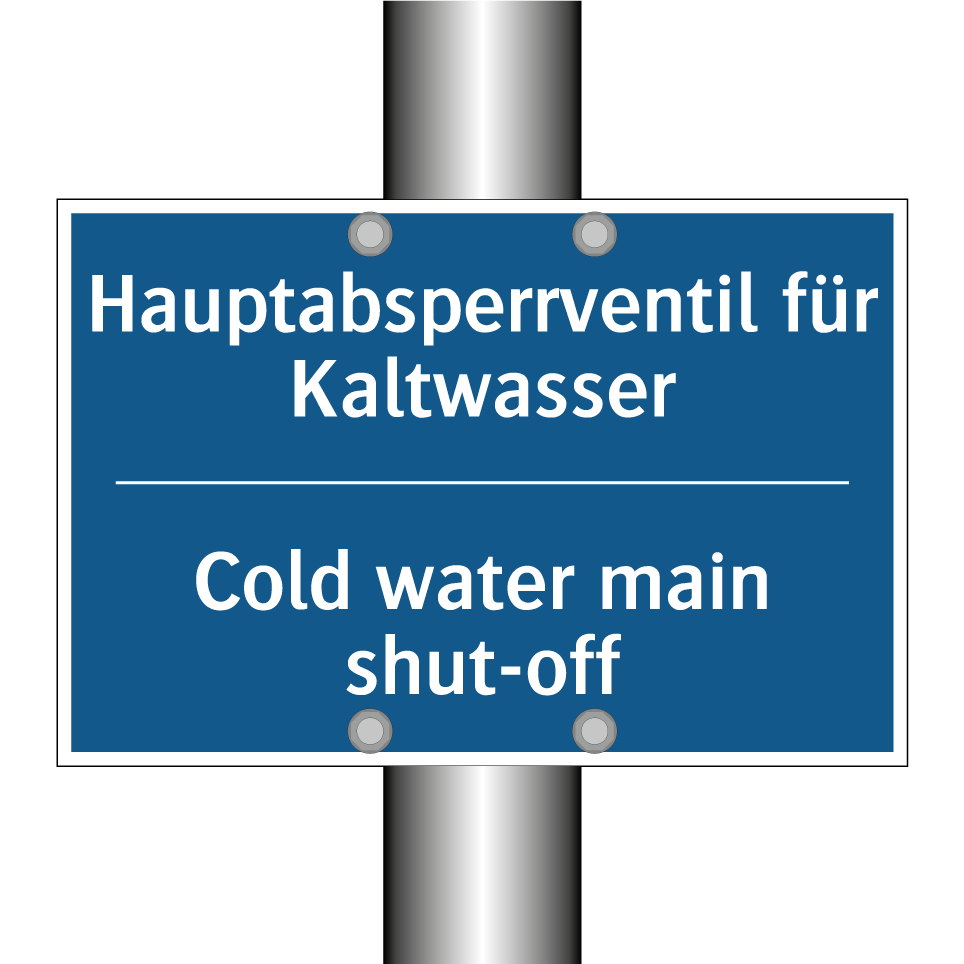 Zweisprachiges Verbotsschild mit deutschem Text Hauptabsperrventil für Kaltwasser und englischem Text Cold water main shut-off