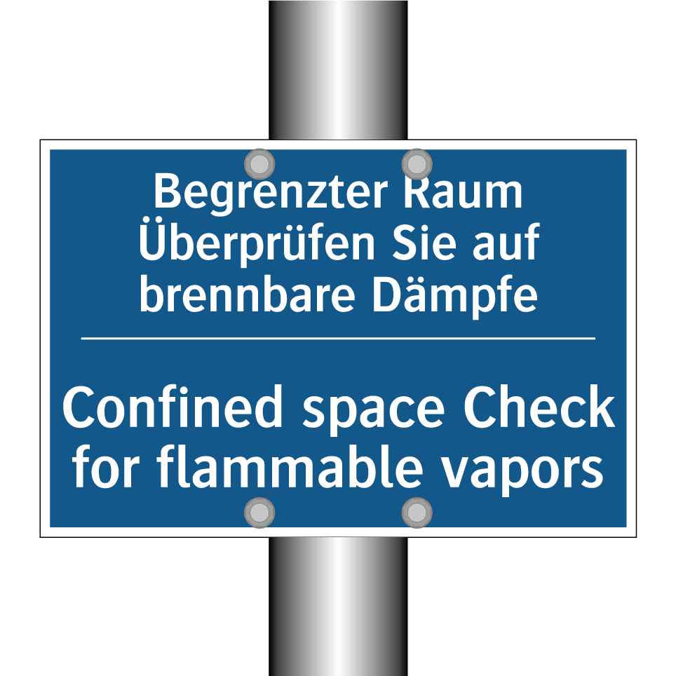 Zweisprachiges Verbotsschild mit deutschem Text Begrenzter Raum Überprüfen Sie auf brennbare Dämpfe und englischem Text Confined space Check for flammable vapors