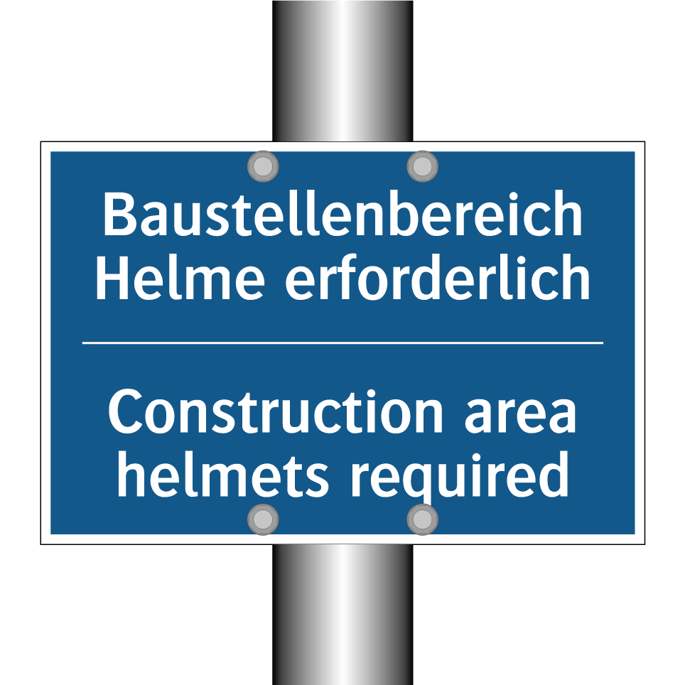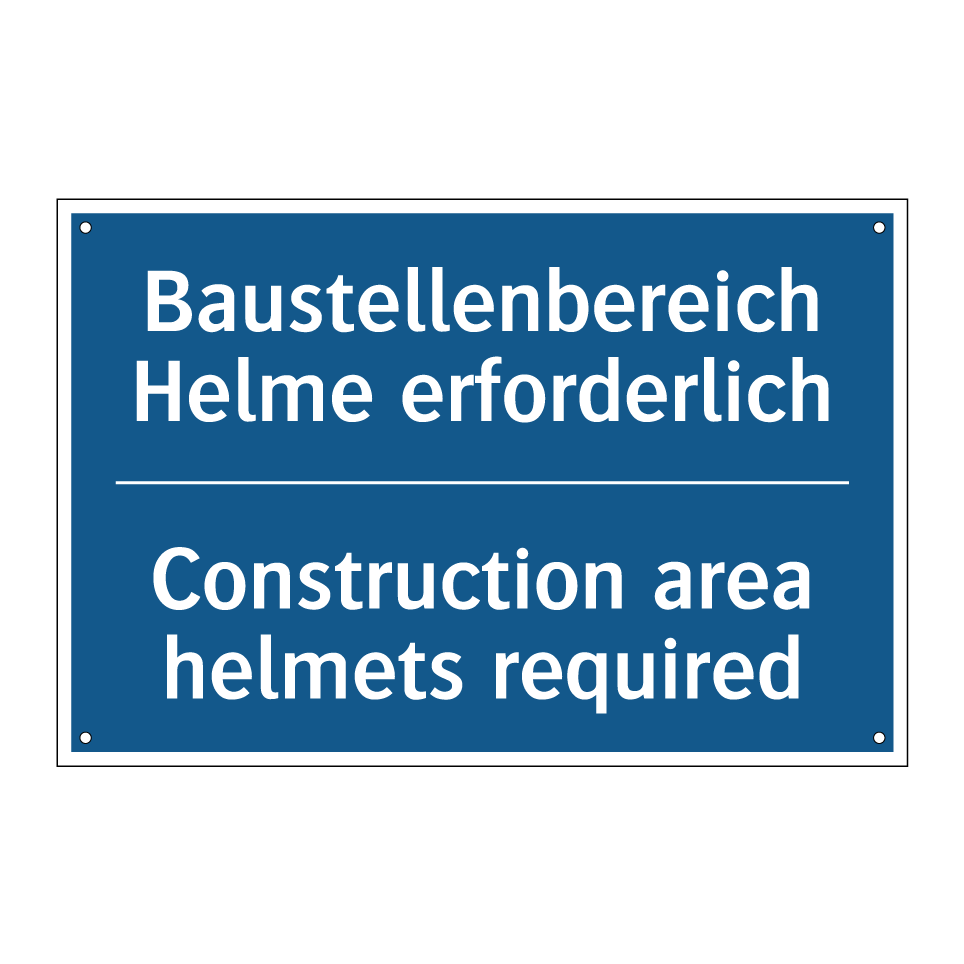 Zweisprachiges Verbotsschild mit deutschem Text Baustellenbereich Helme erforderlich und englischem Text Construction area helmets required