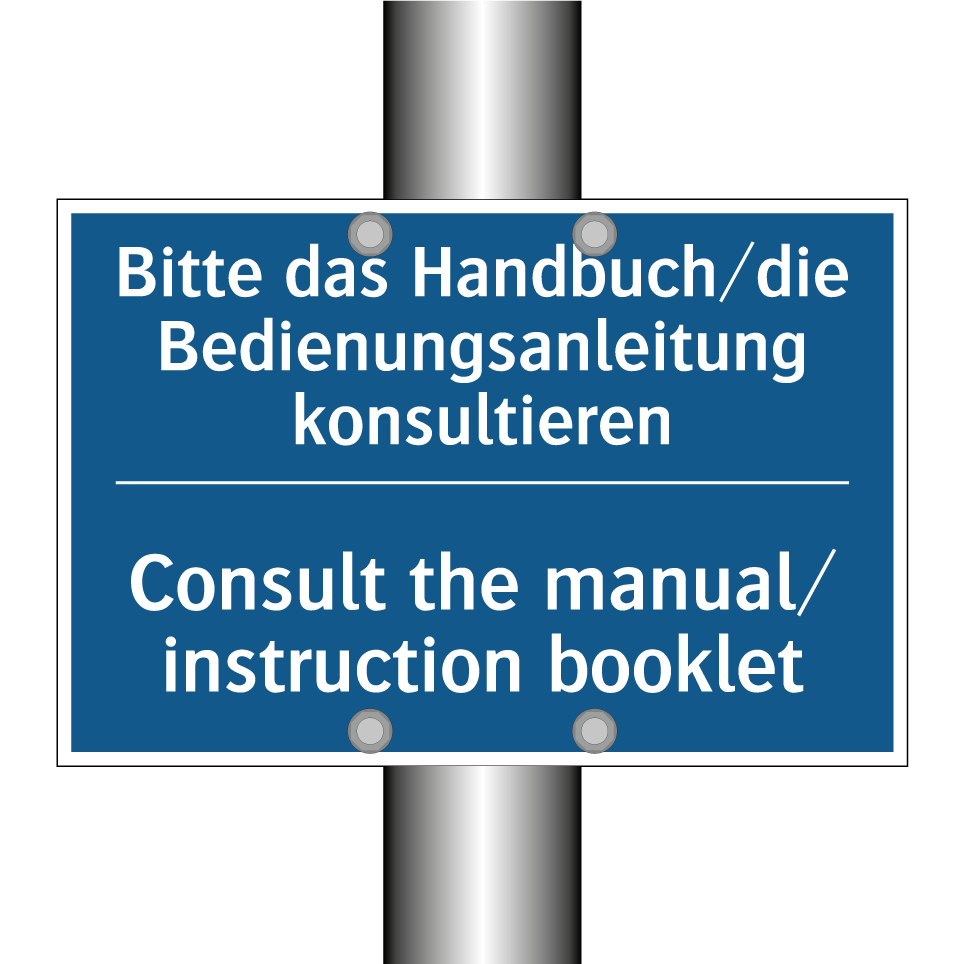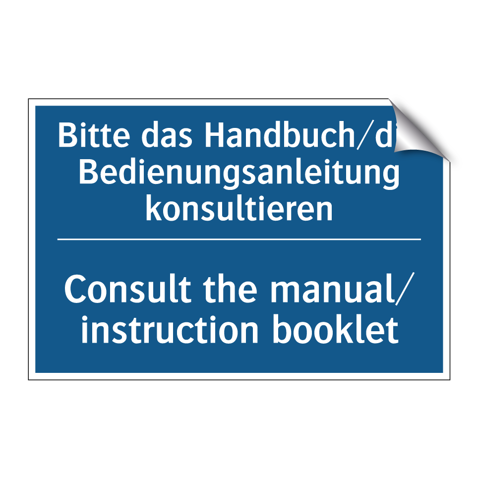 Zweisprachiges Verbotsschild mit deutschem Text Bitte das Handbuch/die Bedienungsanleitung konsultieren und englischem Text Consult the manual/ instruction booklet