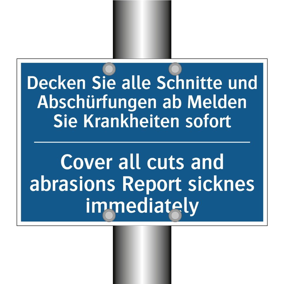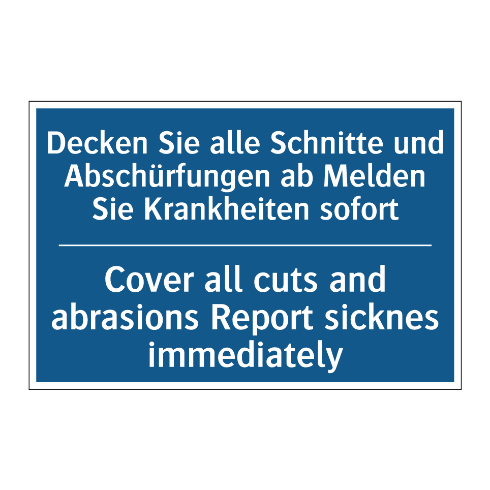 Zweisprachiges Verbotsschild mit deutschem Text Decken Sie alle Schnitte und Abschürfungen ab Melden Sie Krankheiten sofort und englischem Text Cover all cuts and abrasions Report sicknes immediately