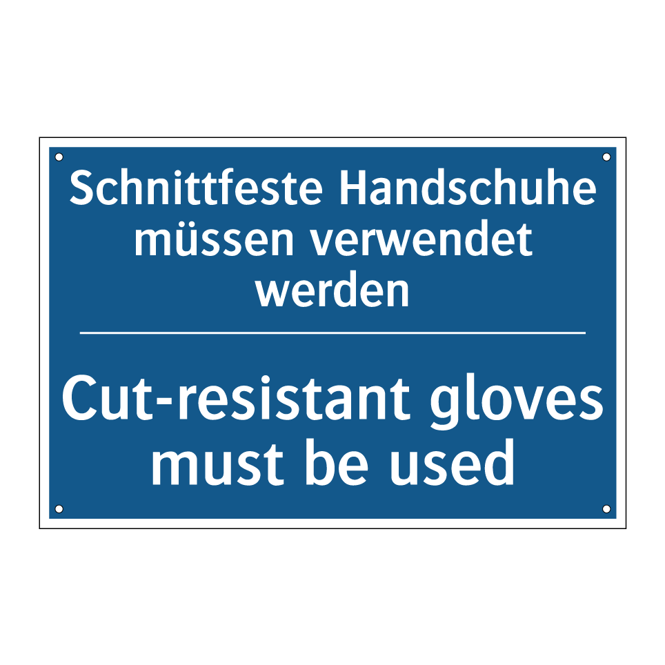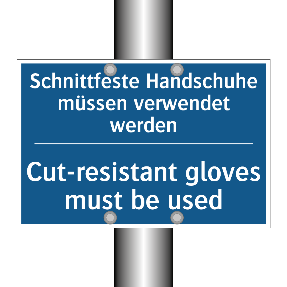 Zweisprachiges Verbotsschild mit deutschem Text Schnittfeste Handschuhe müssen verwendet werden und englischem Text Cut-resistant gloves must be used