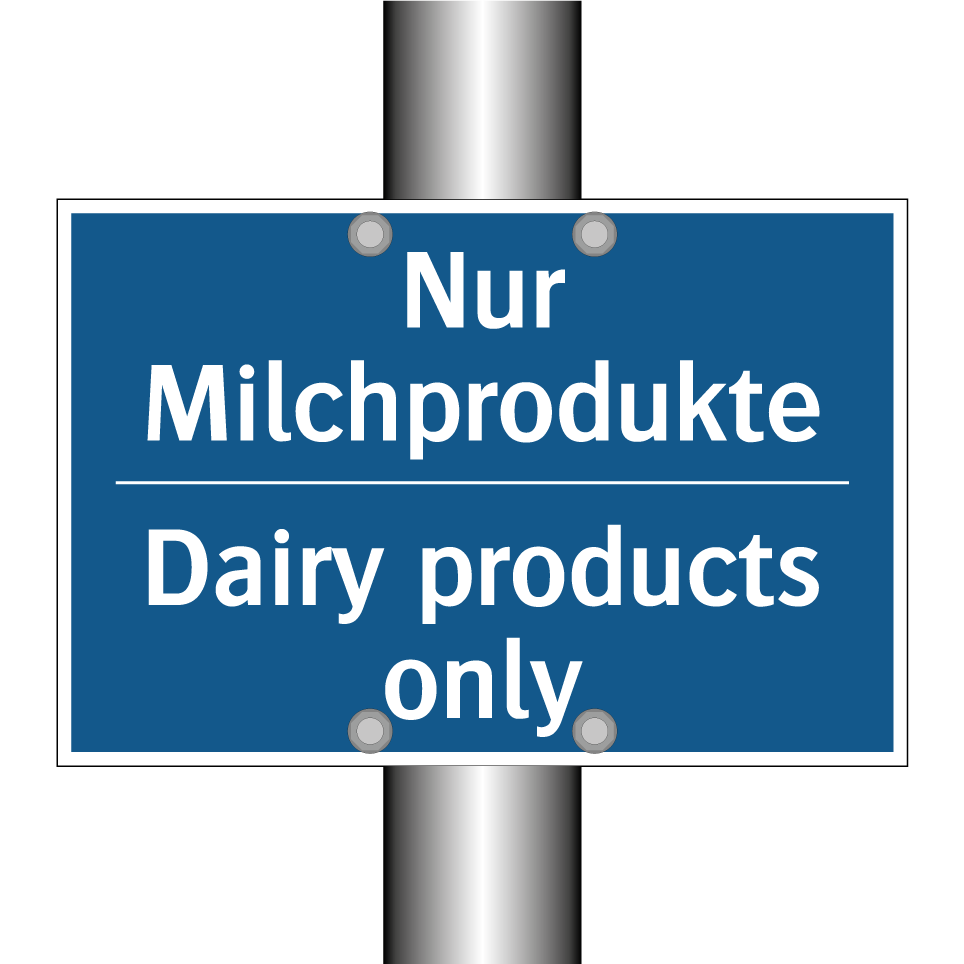 Zweisprachiges Verbotsschild mit deutschem Text Nur Milchprodukte und englischem Text Dairy products only