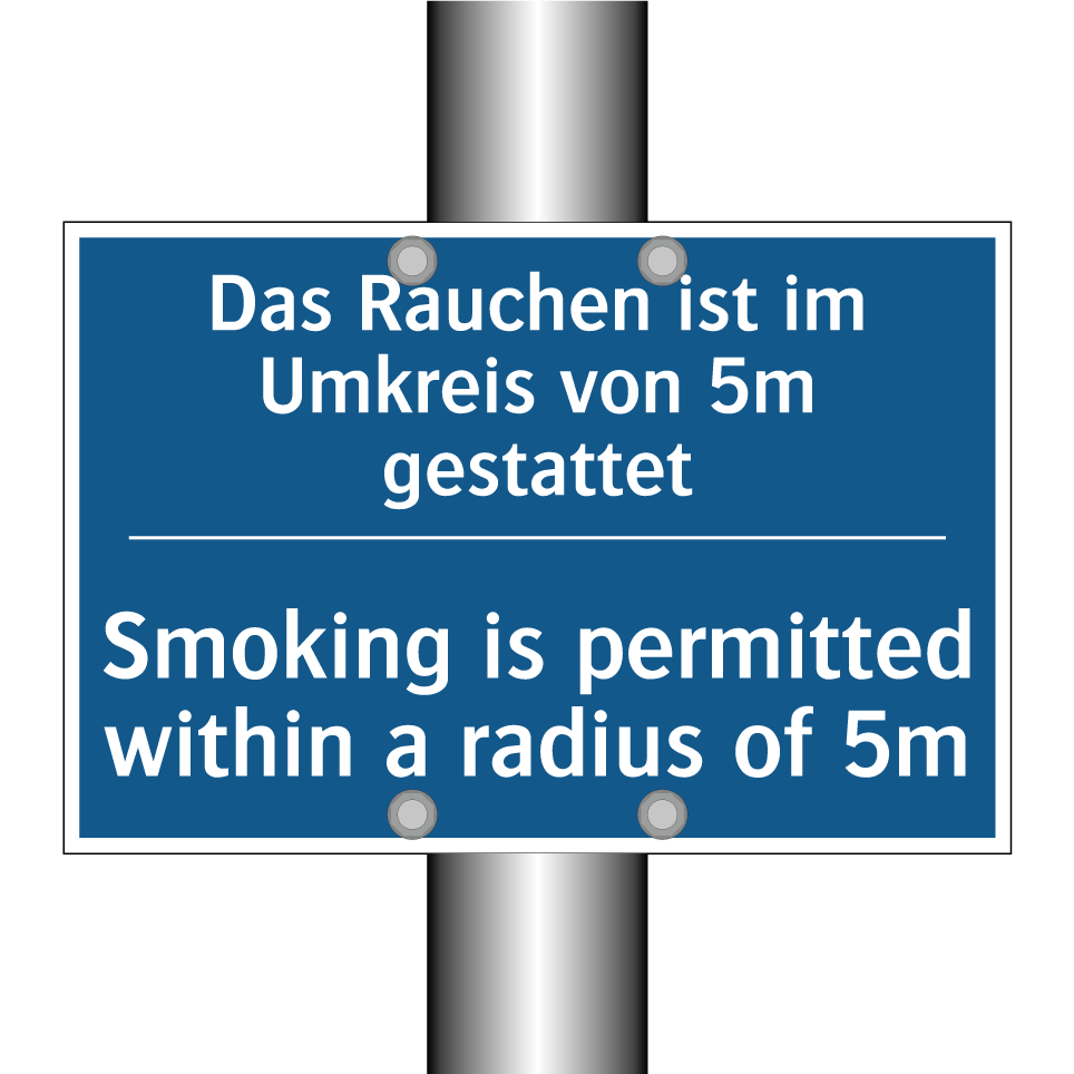 Diese Gebotsschild ist ideal für Bereiche, in denen das Rauchen in einem bestimmten Umkreis erlaubt ist. Mit ihrer zweisprachigen Beschriftung auf Deutsch und Englisch ist sie besonders nützlich in internationalen Umgebungen, wie Flughäfen, Bahnhöfen oder großen Bürokomplexen, wo Besucher aus verschiedenen Ländern erwartet werden. Die klare blaue Hintergrundfarbe mit weißem Text sorgt für eine deutliche Sichtbarkeit und Verständlichkeit. Diese Gebotsschild kann an Eingängen, in Raucherzonen oder in der Nähe von Gebäuden platziert werden, um Raucher auf die erlaubte Zone hinzuweisen. Die zweisprachige Gestaltung fördert die Kommunikation und reduziert Missverständnisse, was sie zu einer wertvollen Ergänzung für multikulturelle Umgebungen macht.