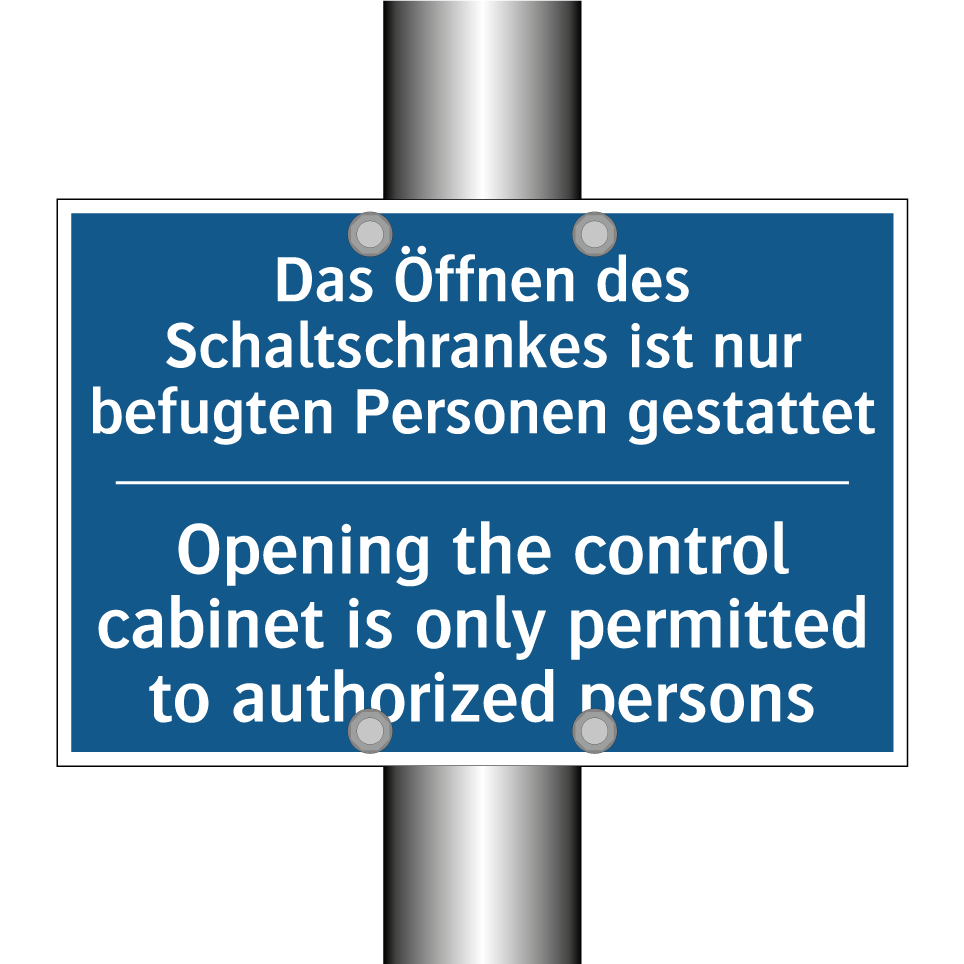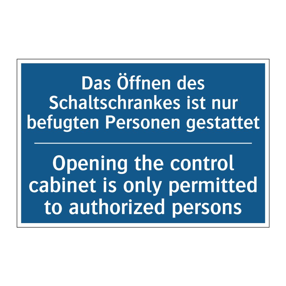 Zweisprachiges Verbotsschild mit deutschem Text Das Öffnen des Schaltschrankes ist nur befugten Personen gestattet und englischem Text Opening the control cabinet is only permitted to authorized persons