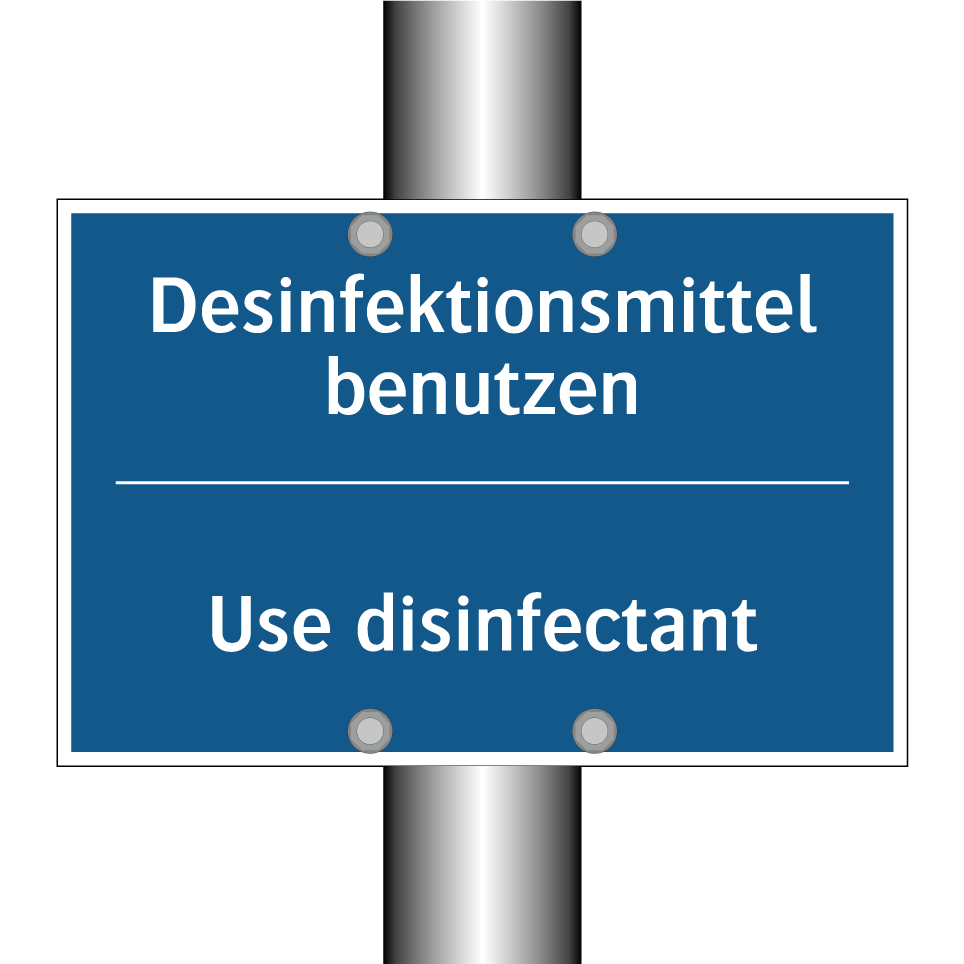 Zweisprachiges Verbotsschild mit deutschem Text Desinfektionsmittel benutzen und englischem Text Use disinfectant
