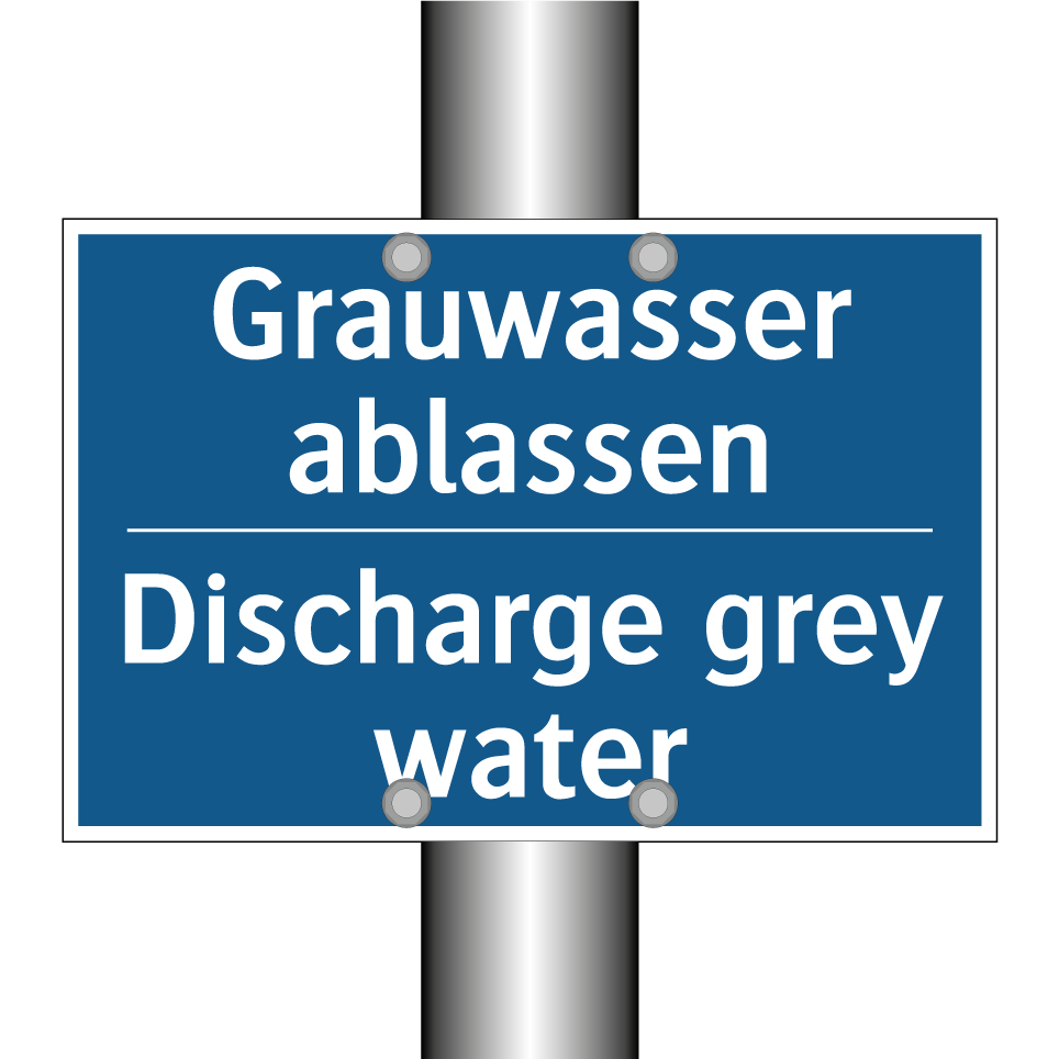 Zweisprachiges Verbotsschild mit deutschem Text Grauwasser ablassen und englischem Text Discharge grey water