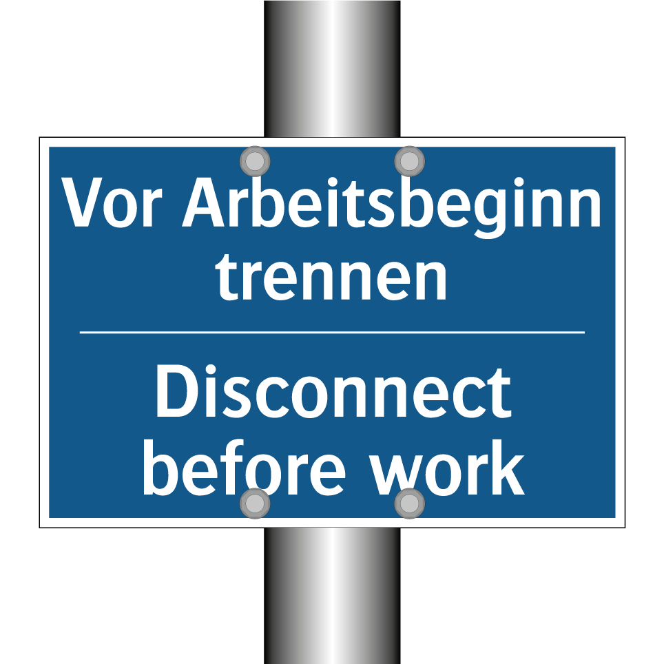 Zweisprachiges Verbotsschild mit deutschem Text Vor Arbeitsbeginn trennen und englischem Text Disconnect before work