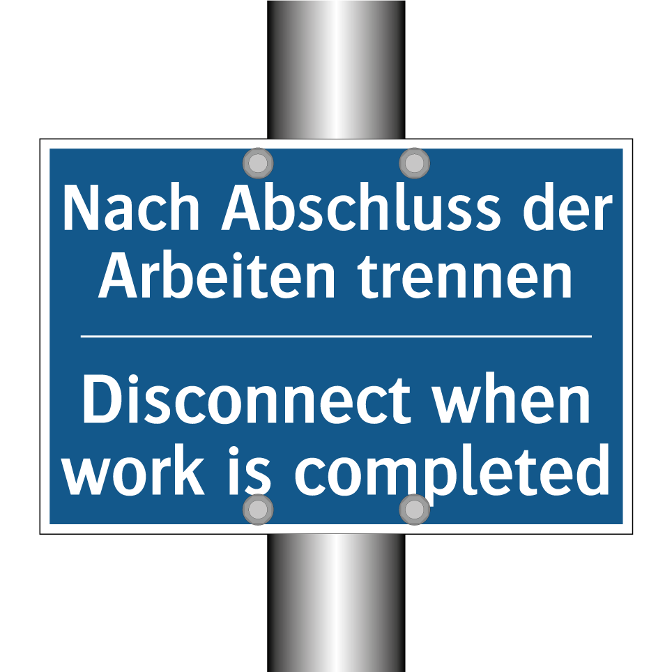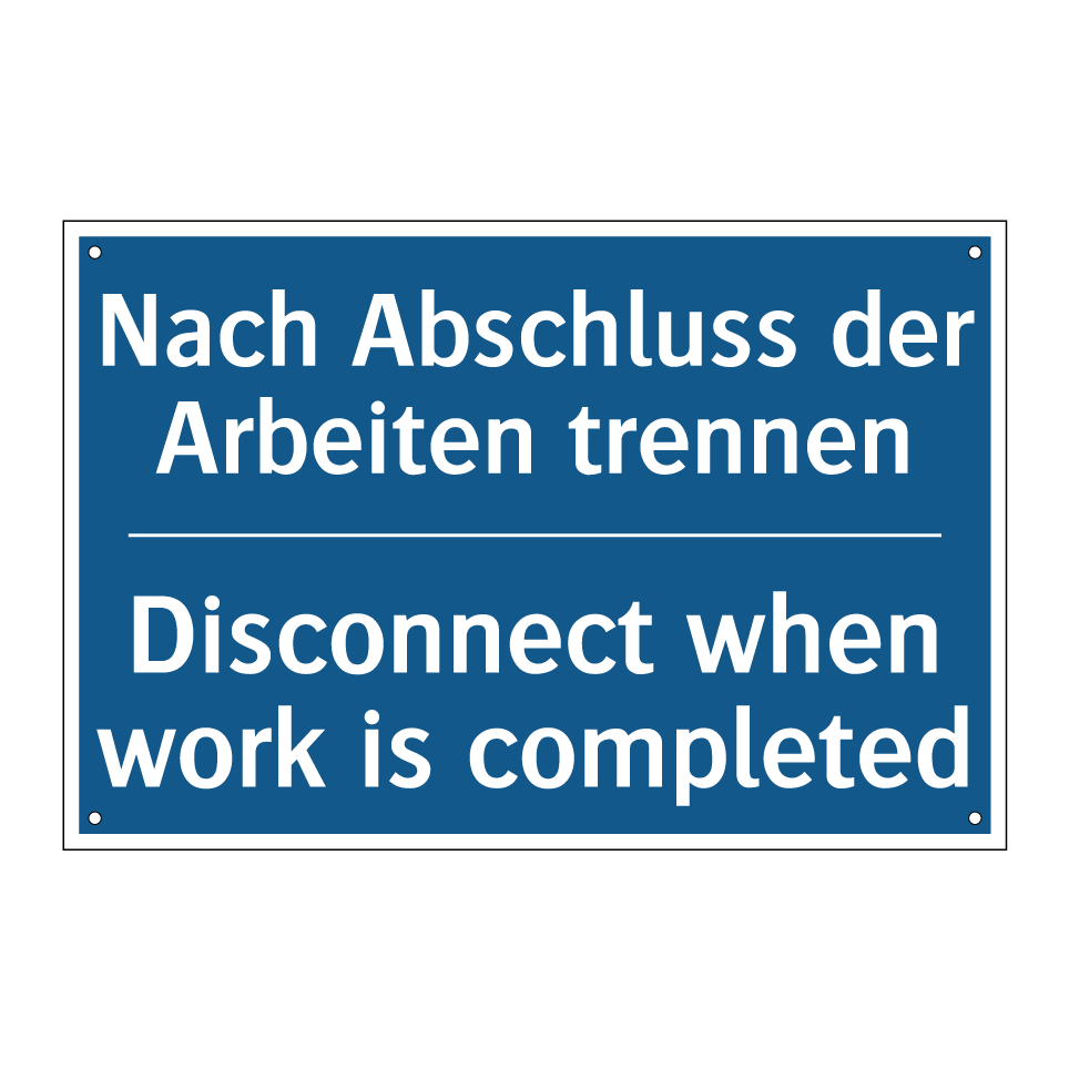 Zweisprachiges Verbotsschild mit deutschem Text Nach Abschluss der Arbeiten trennen und englischem Text Disconnect when work is completed