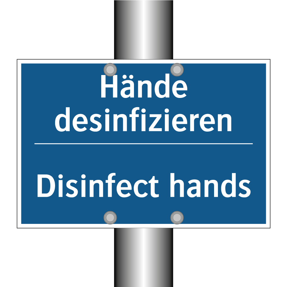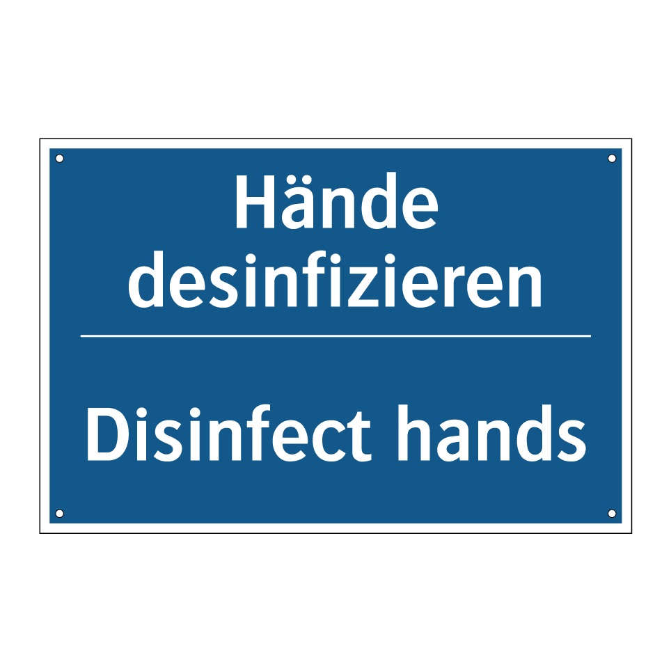 Zweisprachiges Verbotsschild mit deutschem Text Hände desinfizieren und englischem Text Disinfect hands