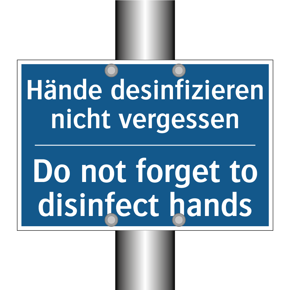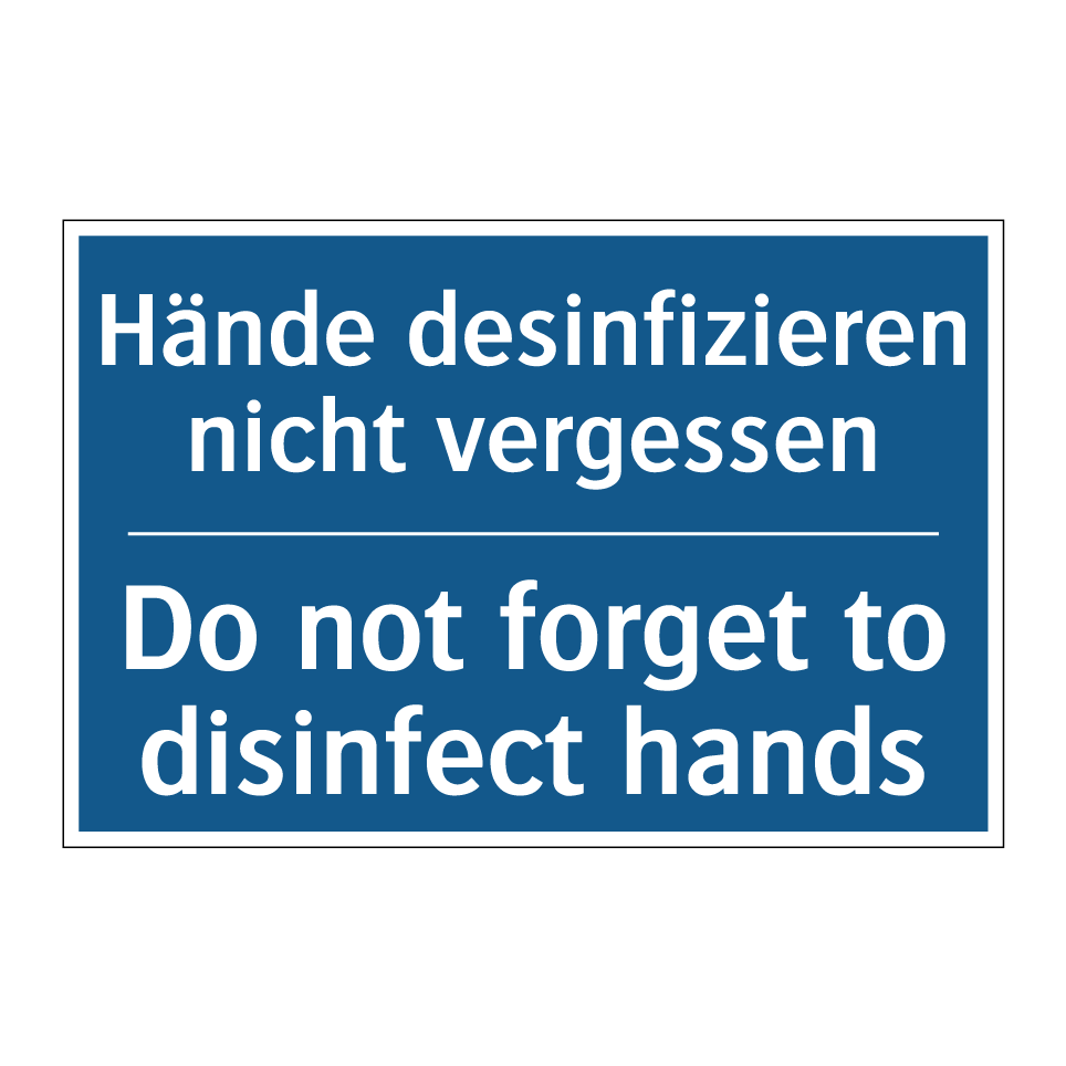 Zweisprachiges Verbotsschild mit deutschem Text Hände desinfizieren nicht vergessen und englischem Text Do not forget to disinfect hands