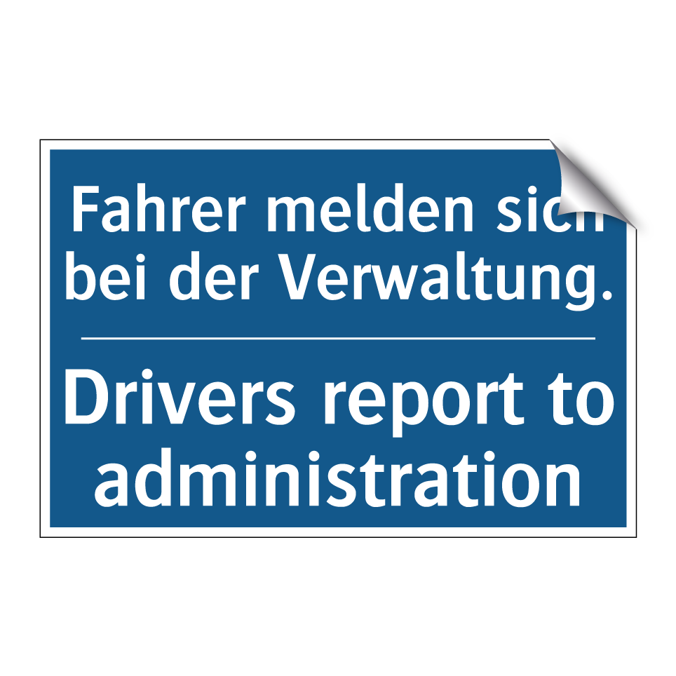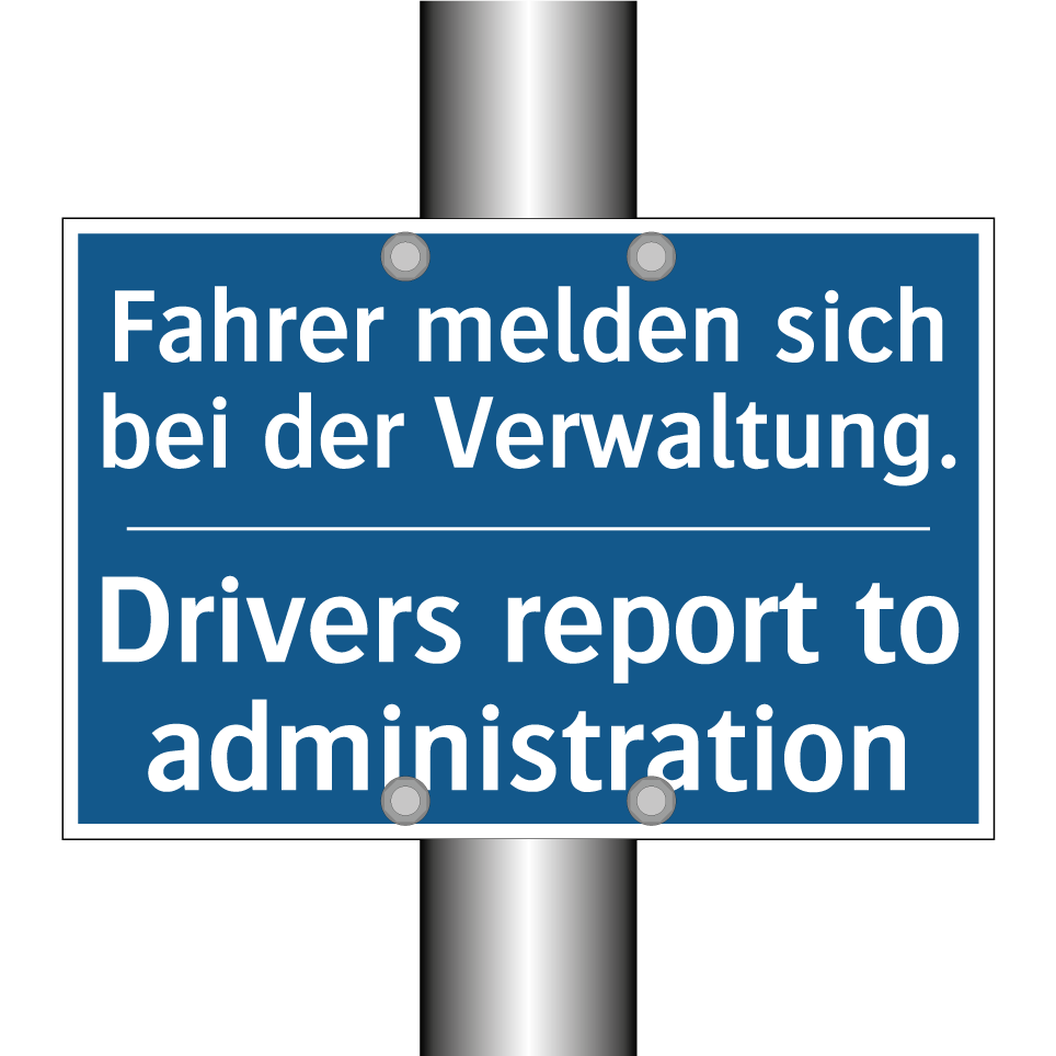 Zweisprachiges Verbotsschild mit deutschem Text Fahrer melden sich bei der Verwaltung. und englischem Text Drivers report to administration