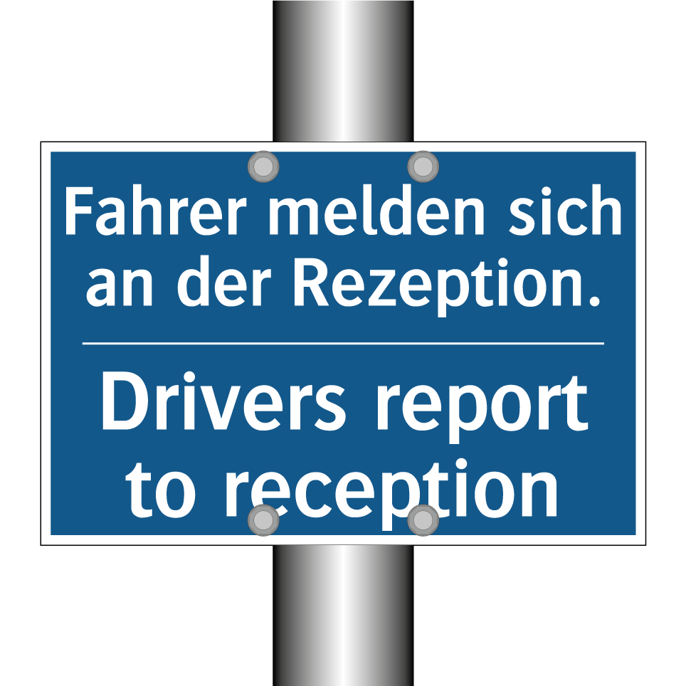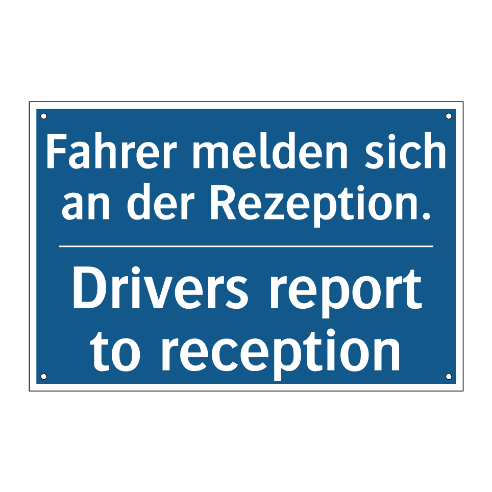 Zweisprachiges Verbotsschild mit deutschem Text Fahrer melden sich an der Rezeption. und englischem Text Drivers report to reception