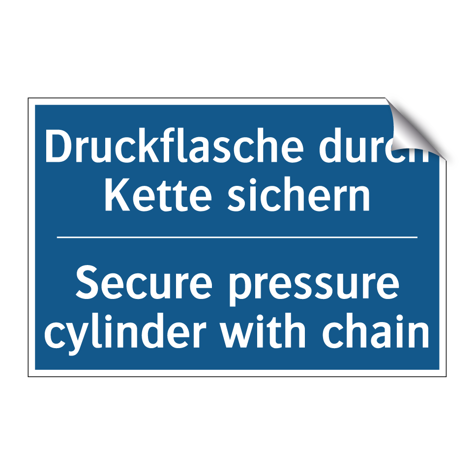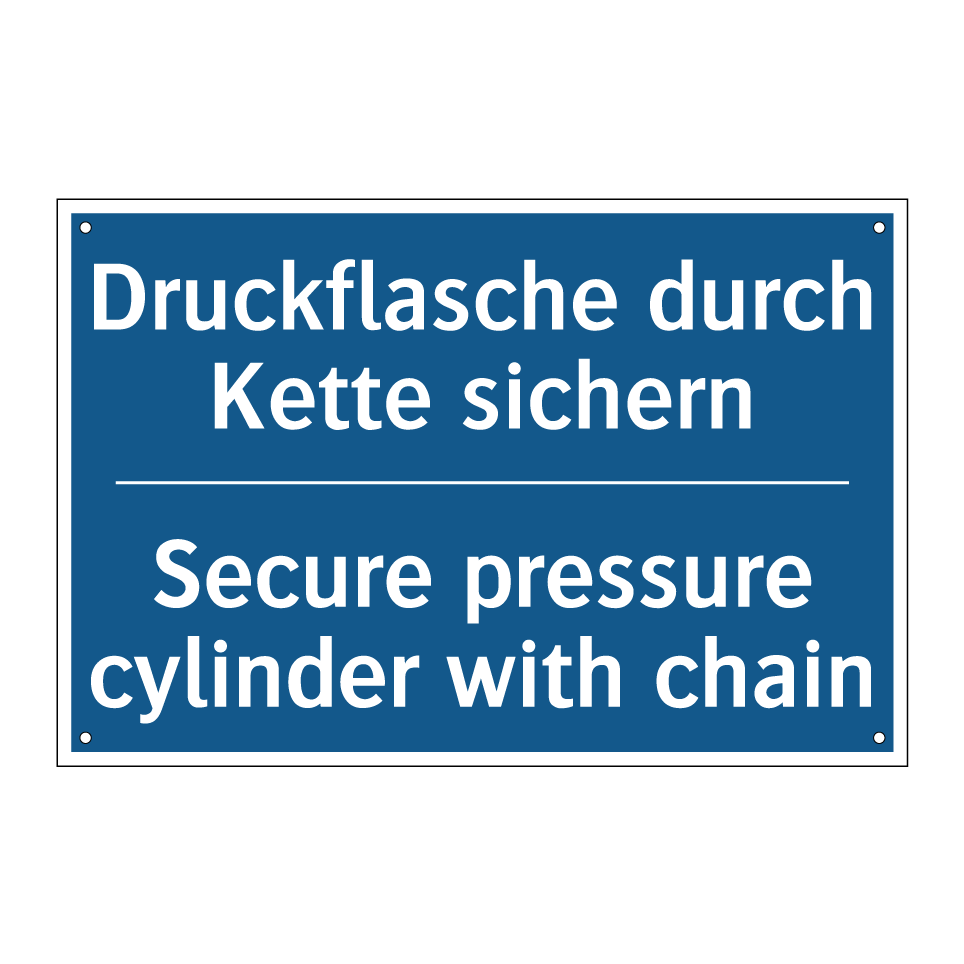 Zweisprachiges Verbotsschild mit deutschem Text Druckflasche durch Kette sichern und englischem Text Secure pressure cylinder with chain
