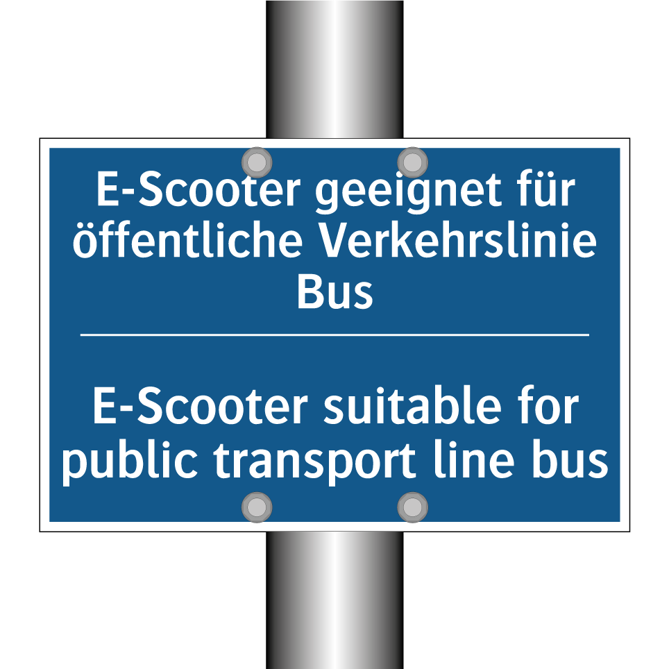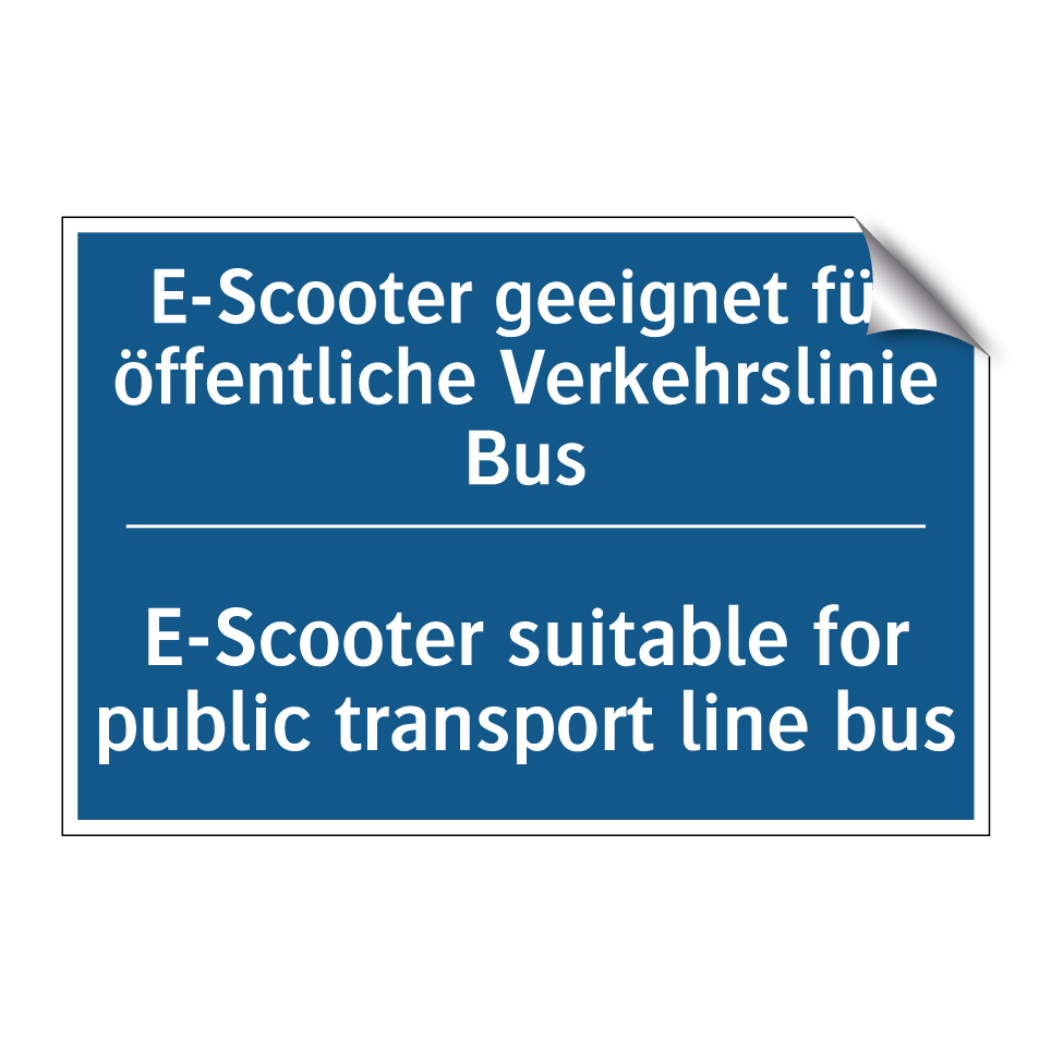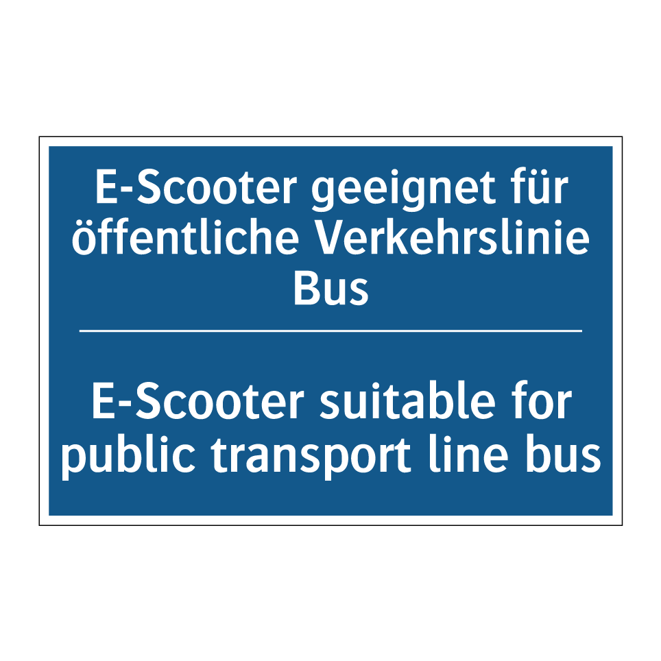 Zweisprachiges Verbotsschild mit deutschem Text E-Scooter geeignet für öffentliche Verkehrslinie Bus und englischem Text E-Scooter suitable for public transport line bus