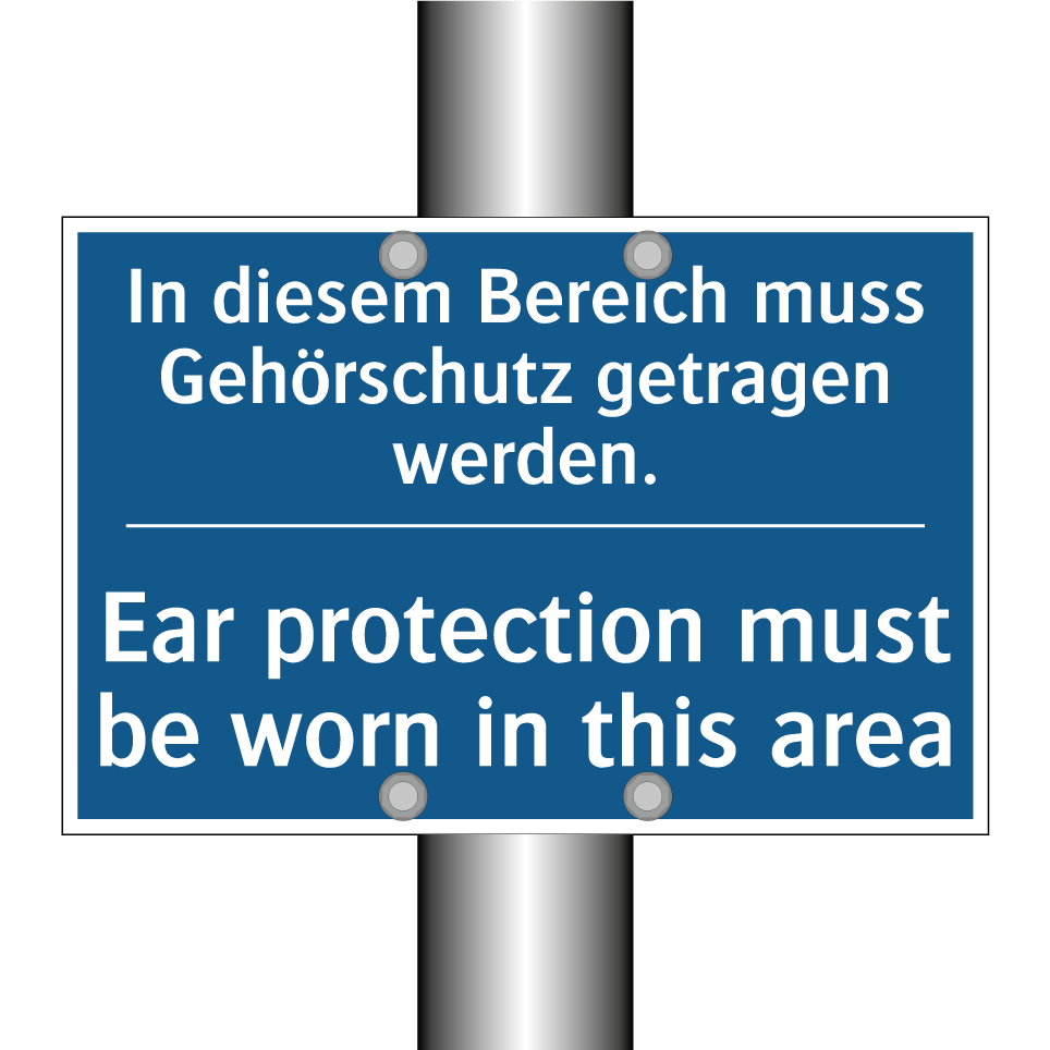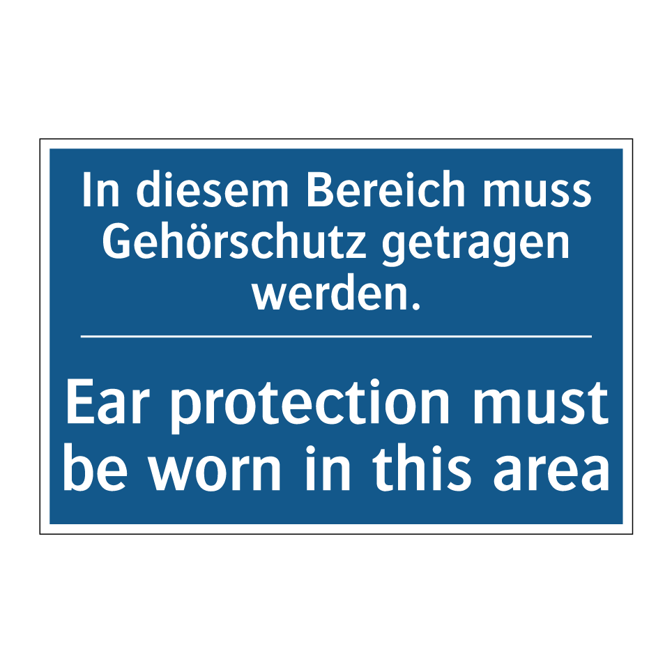 Zweisprachiges Verbotsschild mit deutschem Text In diesem Bereich muss Gehörschutz getragen werden. und englischem Text Ear protection must be worn in this area