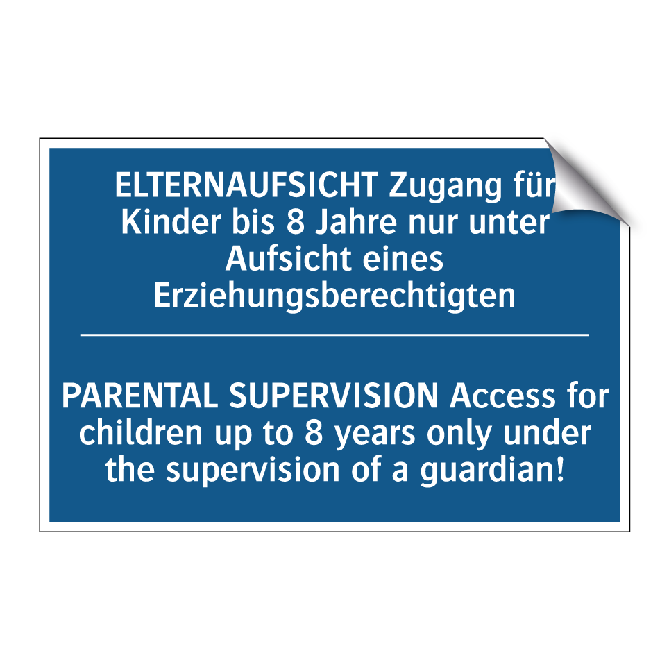 Zweisprachiges Verbotsschild mit deutschem Text ELTERNAUFSICHT Zugang für Kinder bis 8 Jahre nur unter Aufsicht eines Erziehungsberechtigten und englischem Text PARENTAL SUPERVISION Access for children up to 8 years only under the supervision of a guardian!