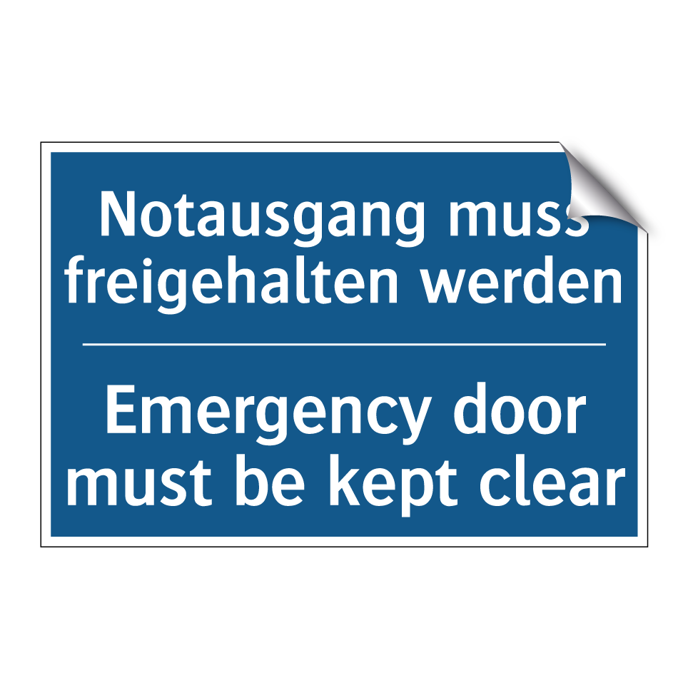 Entdecken Sie die Vielseitigkeit dieser zweisprachigen Gebotsschild, die sowohl auf Deutsch als auch auf Englisch klare Anweisungen gibt. Diese Sicherheitskennzeichnung ist ideal für Bereiche, in denen Notausgänge stets frei zugänglich sein müssen. Platzieren Sie sie in öffentlichen Gebäuden, Büros, Schulen oder Einkaufszentren, um sicherzustellen, dass Fluchtwege nicht blockiert werden. Die zweisprachige Beschriftung erhöht die Verständlichkeit für ein internationales Publikum und fördert die Einhaltung von Sicherheitsvorschriften. Diese Gebotsschild ist ein unverzichtbares Element für jeden Ort, an dem Sicherheit oberste Priorität hat.
