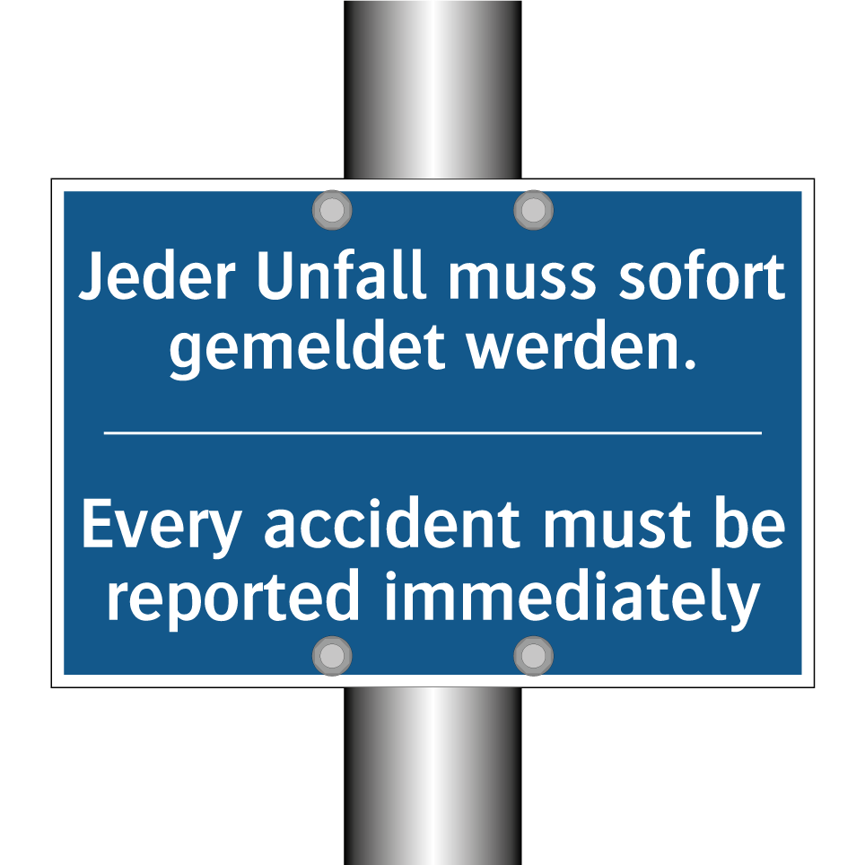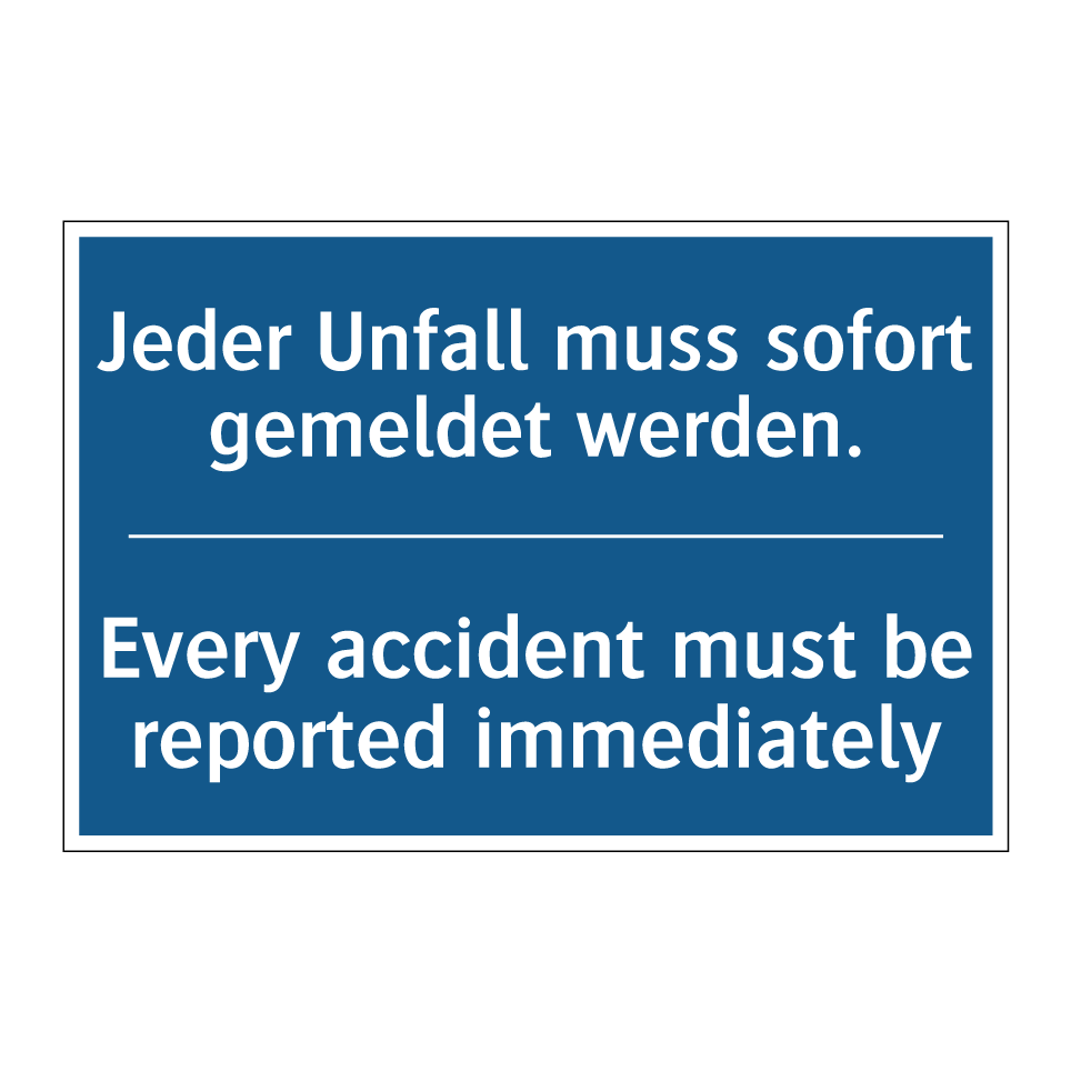 Zweisprachiges Verbotsschild mit deutschem Text Jeder Unfall muss sofort gemeldet werden. und englischem Text Every accident must be reported immediately