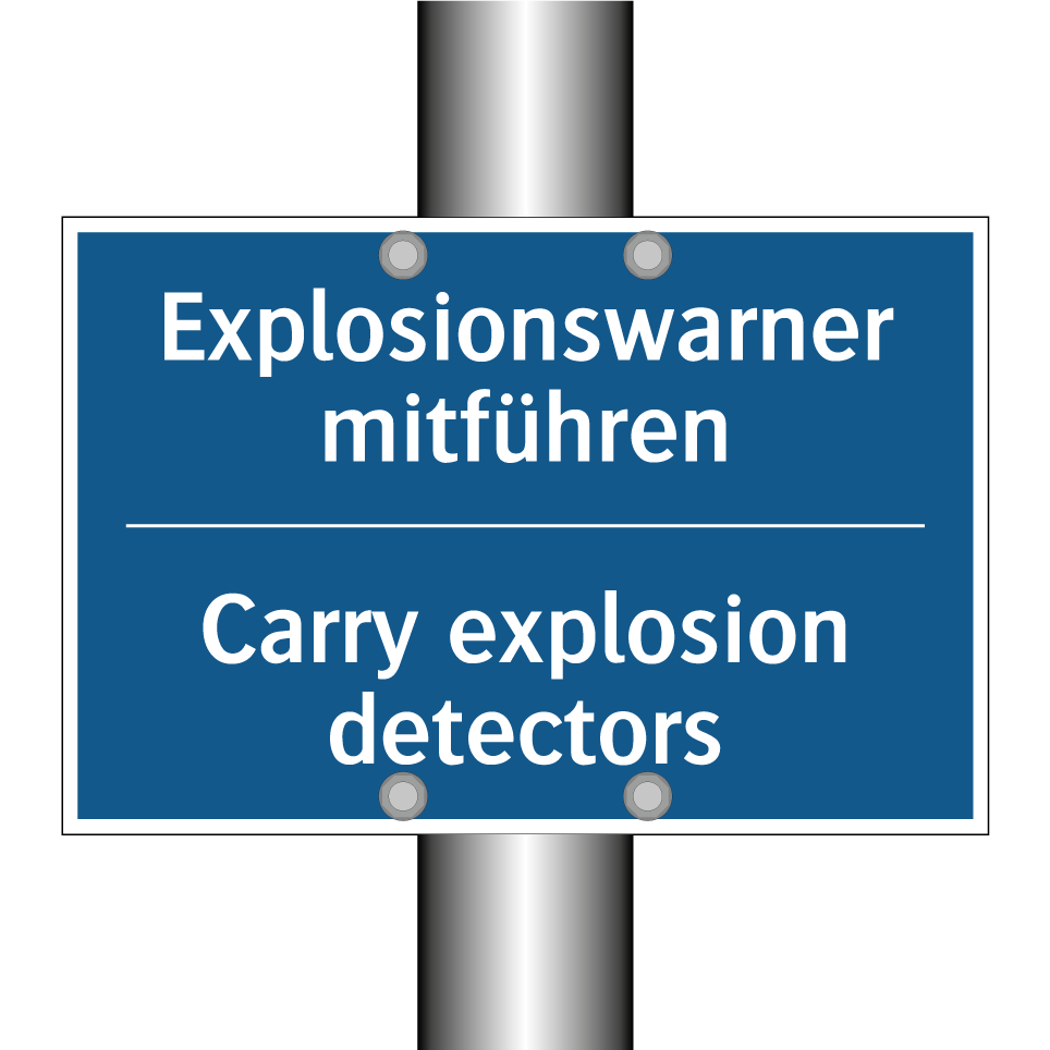 Zweisprachiges Verbotsschild mit deutschem Text Explosionswarner mitführen und englischem Text Carry explosion detectors
