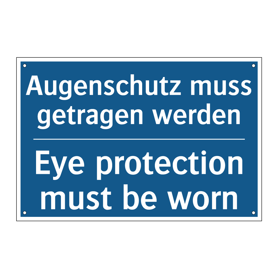 Zweisprachiges Verbotsschild mit deutschem Text Augenschutz muss getragen werden und englischem Text Eye protection must be worn