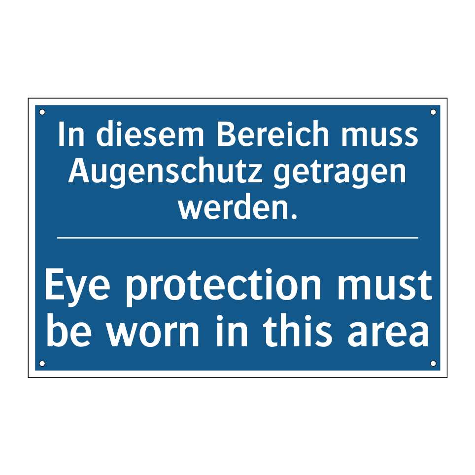 Zweisprachiges Verbotsschild mit deutschem Text In diesem Bereich muss Augenschutz getragen werden. und englischem Text Eye protection must be worn in this area